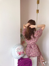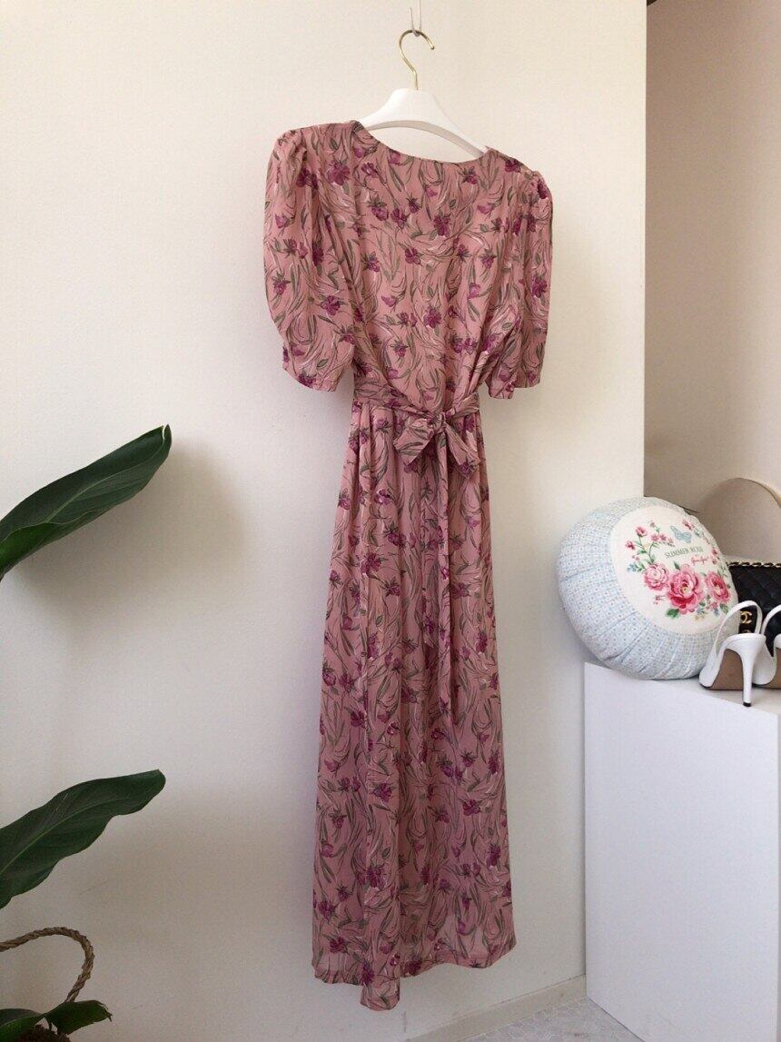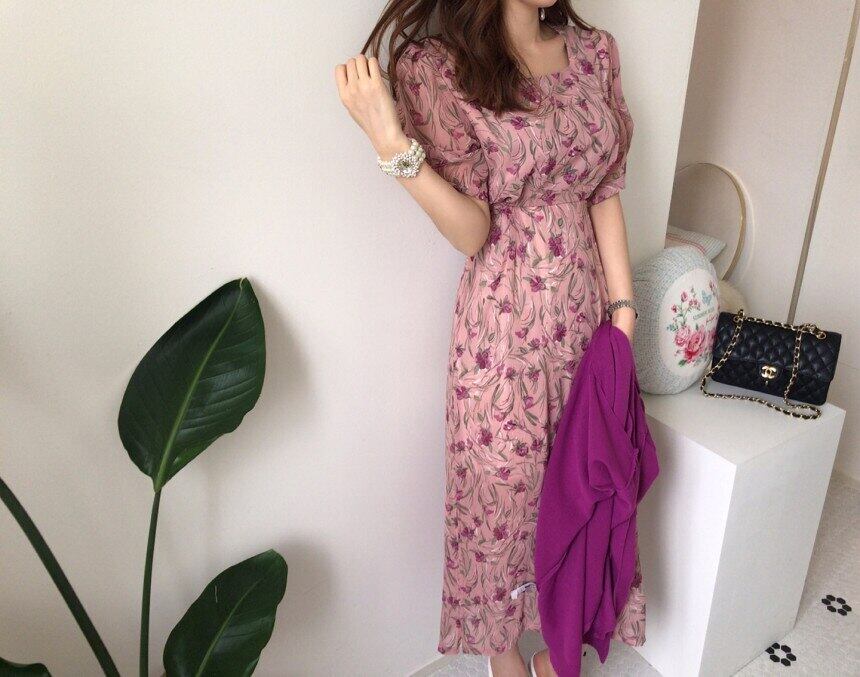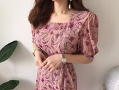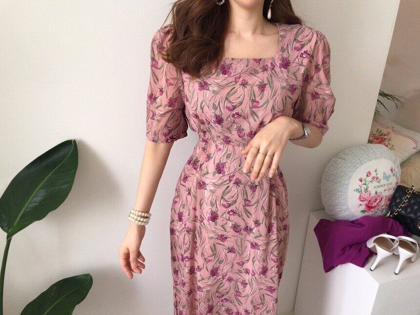 女性ドレスシックな気質スクエアカラーフラワープリントレーシングスリムパフスリーブバッグヒップミディドレスVestidos フラワーデザイン スクウェア