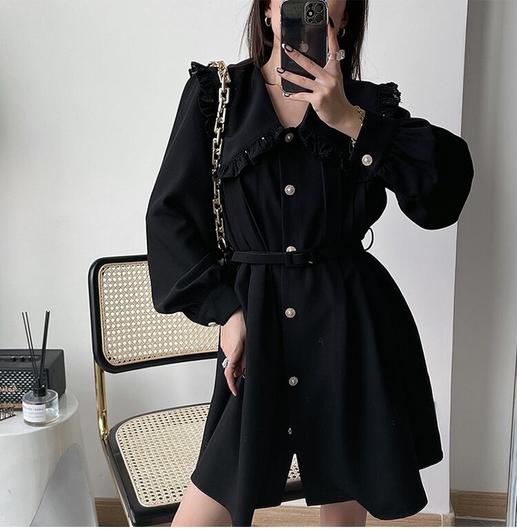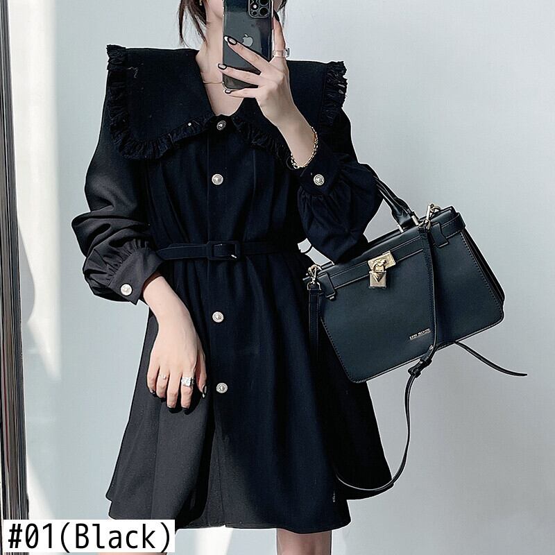 2021年春秋新作フレンチスリム小帯気質ワンピース長袖シングルブレストドールカラーワンピース ロング スプリング 春物 オータム 秋物