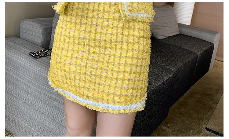 イエローツイードツーピースセットレディースビーディング-トリムミニスカートスーツVネック千鳥格子Telストリートウェア秋冬 オータム 秋物 ウィンター 冬物