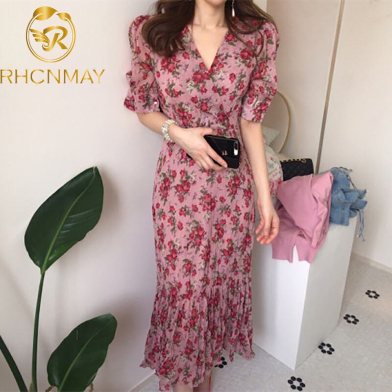 シックな夏の女性のドレスVネック半袖花柄ドレスロングシフォンドレスオフィスレディVestidos ショート ハーフスリーブ サマー 夏物 会社 学校 通勤や通学にも