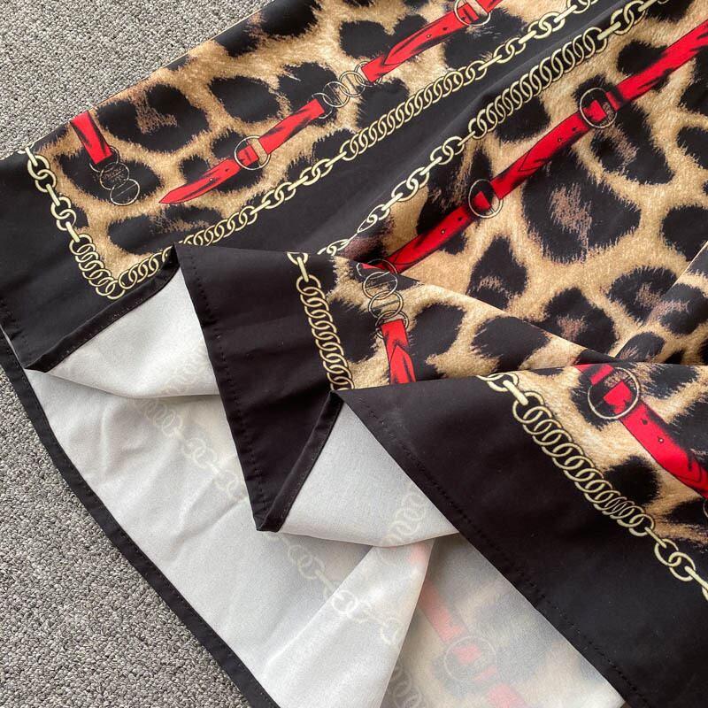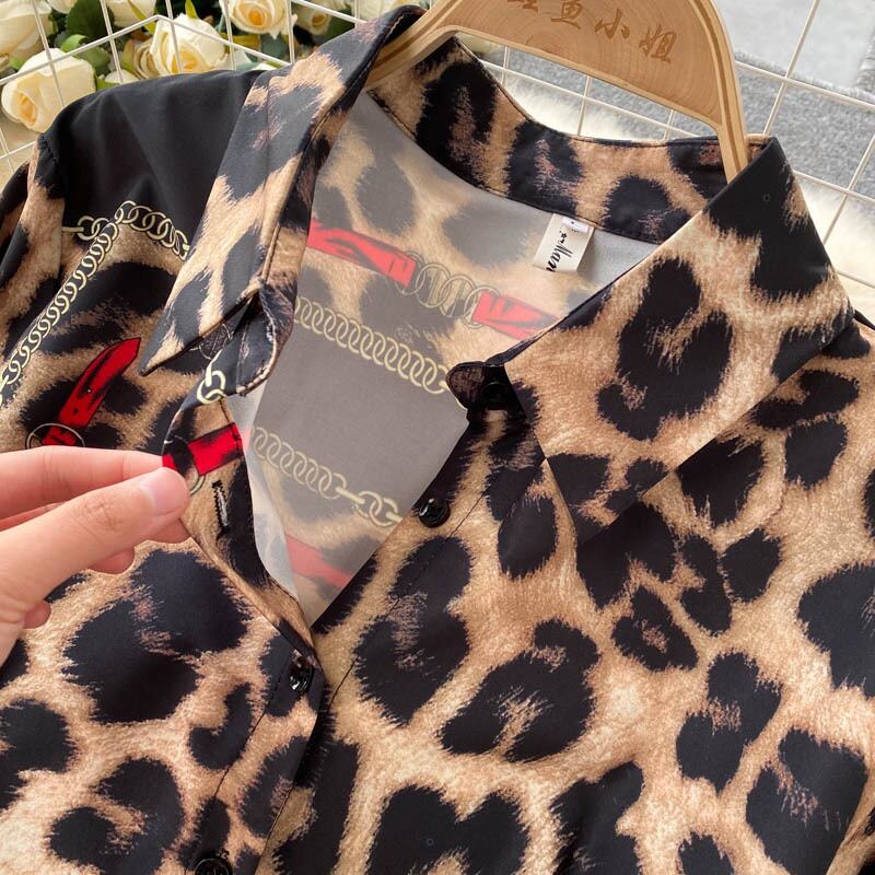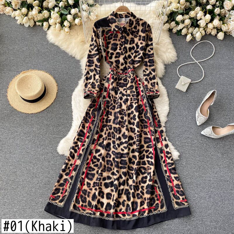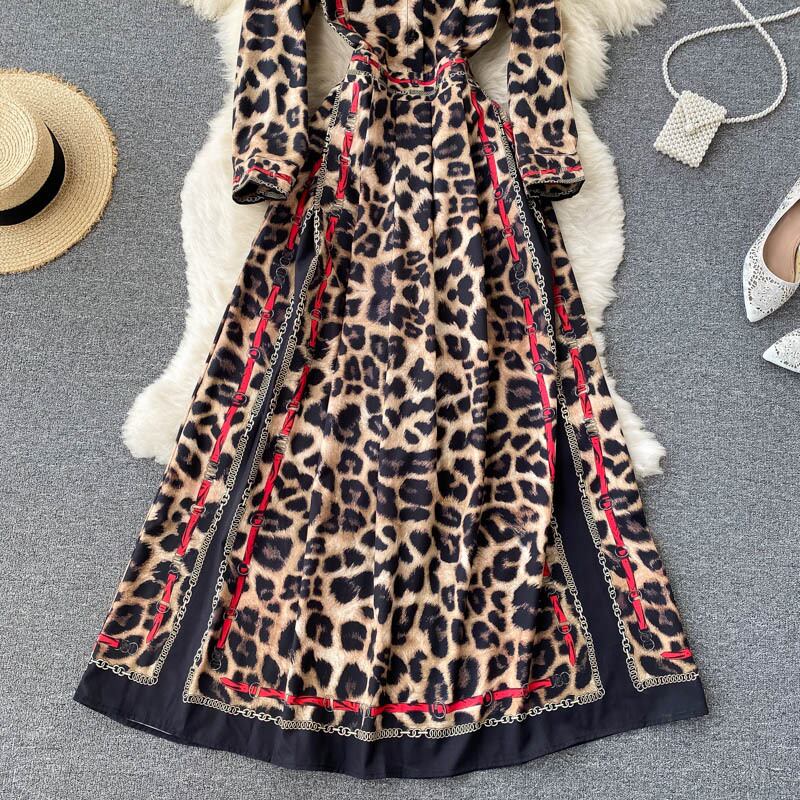 ヴィンテージレオパードプリントマキシドレス女性ターンダウン-襟長袖Aラインドレス秋のストリートウェアロングドレス オータム 秋物 ビンテージ