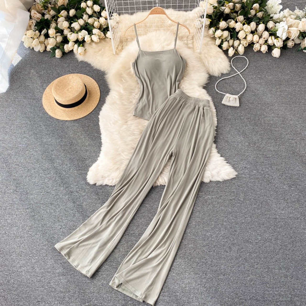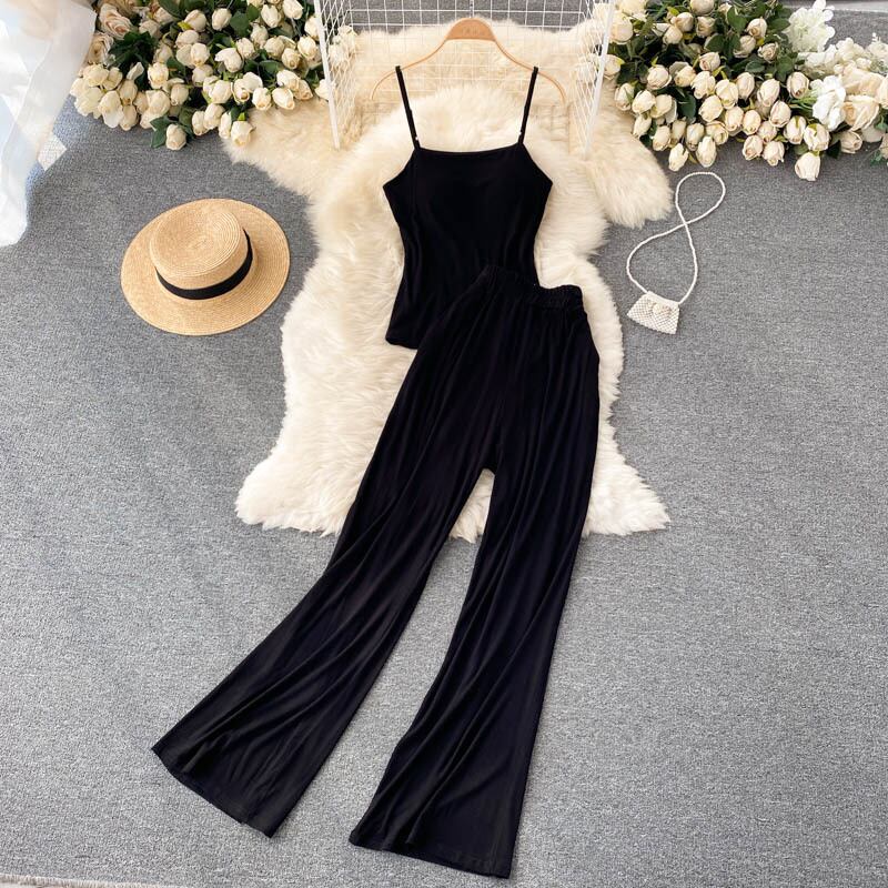 女性2021年夏セットセクシーオフショルダースプリットストラップトップス+ウエストワイドレッグロングパンツツーピーススーツ サマー 夏物 ワイドパンツ