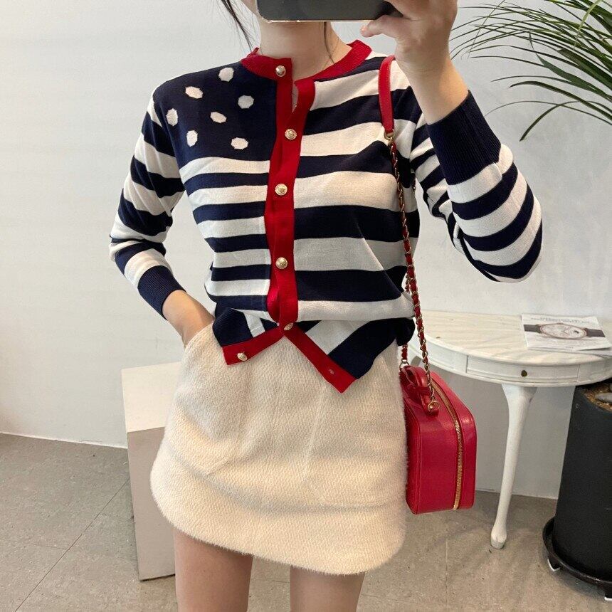 シックなフレンチスプリングフレグランスストライプラウンドネックコントラストカラーセーターレディースゴールドシングルブレストカーディガンドット 春物 Oネック