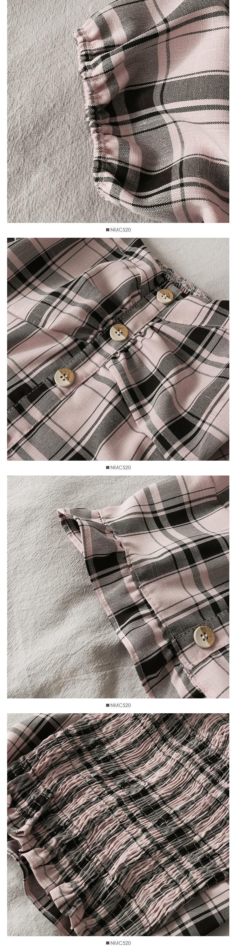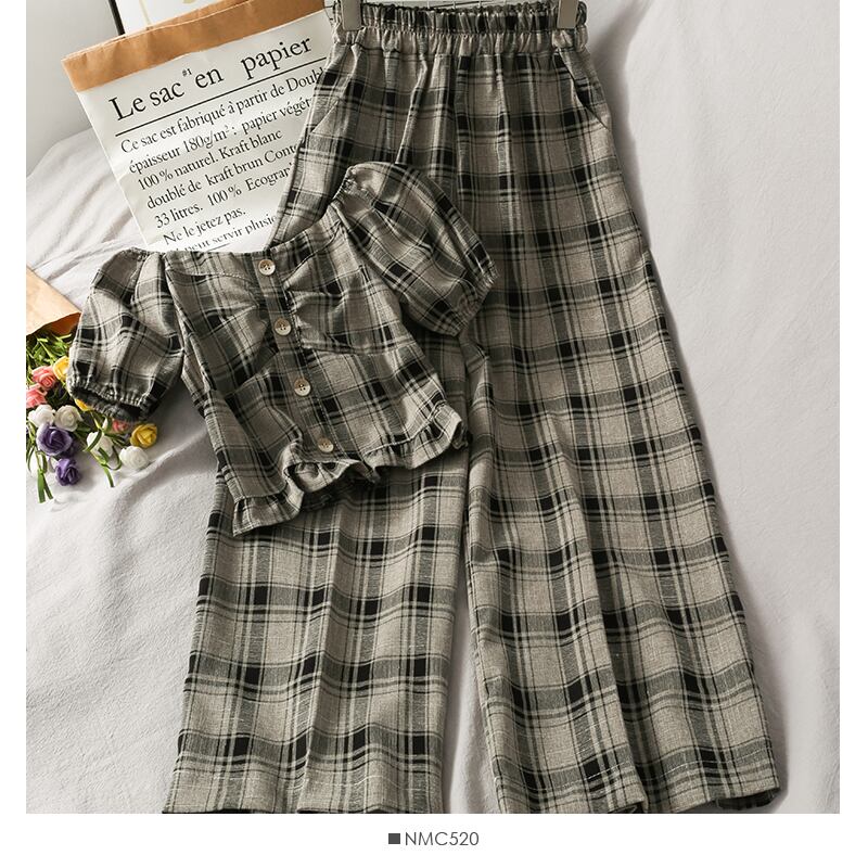 ヴィンテージチェック柄レディース2点セットストリートウェアスラッシュネックボタンブラウスシャツ+ハイウエストワイドレッグパンツセット4色 ワイドパンツ ビンテージ