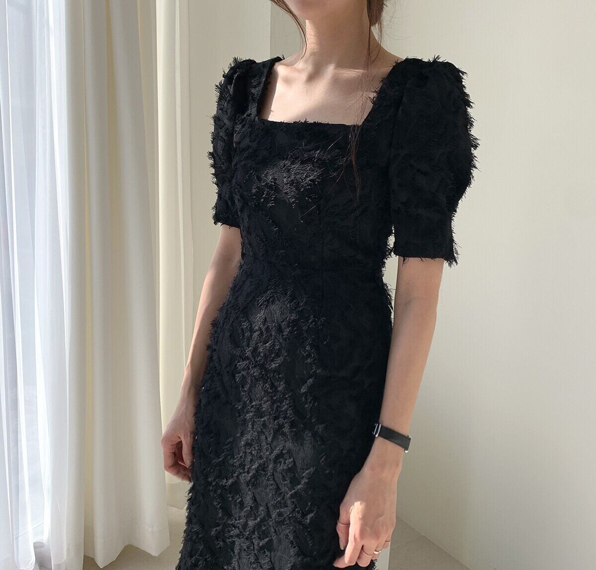 シックな夏の女性のドレススクエアカラー重工業フェザーTelスリムウエストミドル丈バッグヒップドレス サマー 夏物 スクウェア