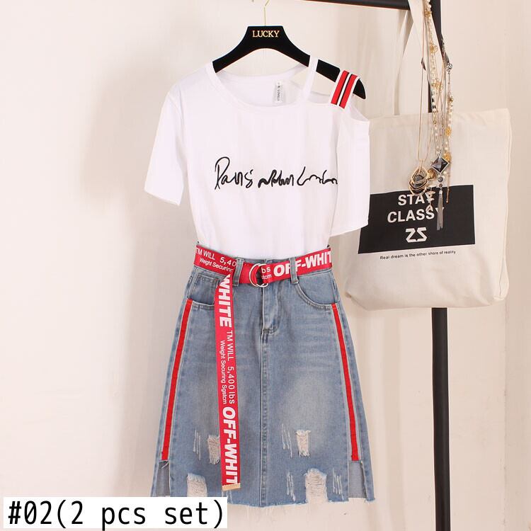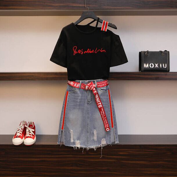 夏のレディースデニムスカートスーツ刺繡レタースラッシュネックTシャツ+サッシテルジャンスカート2点セット 刺繍 サマー 夏物