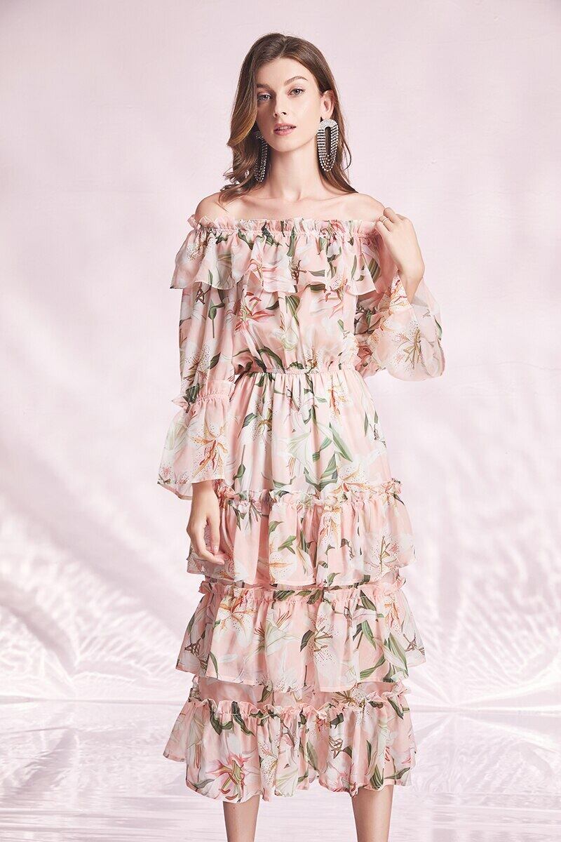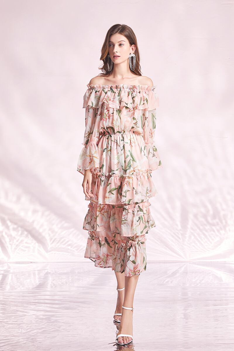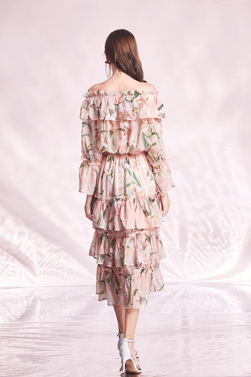 夏休みドレスレディースフローラルプリントティアードレイヤー裾メッシュフリルベルト付きミディホリデーパーティードレス レッド ラッフル サマー 夏物 ハーネス 花柄