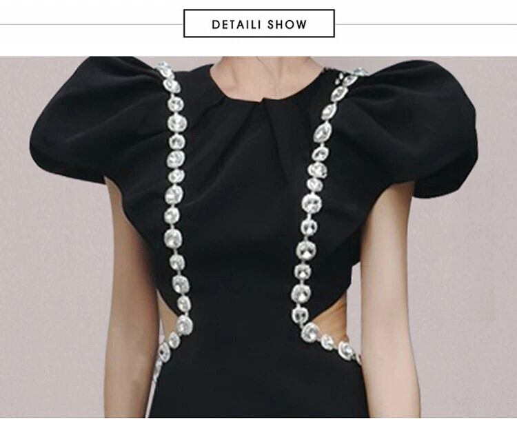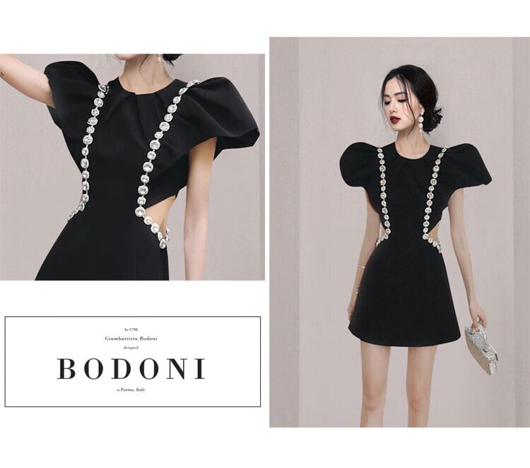 2021夏の中空アウトウエストフレンチスタイルヴィンテージブラックパフスリーブミニドレスセクシーなストラップレスダイヤモンドパーティードレス サマー 夏物 ビンテージ