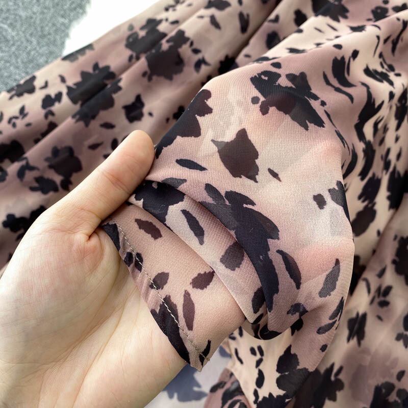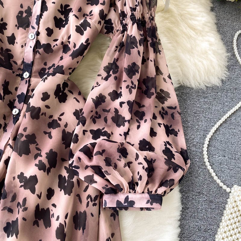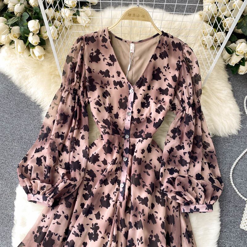 女性フレンチフローラルドレスパフスリーブVネックAライン不規則なドレス秋のボヘミアンバケーションミディドレス オータム 秋物 花柄