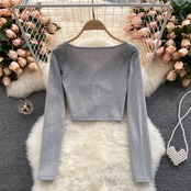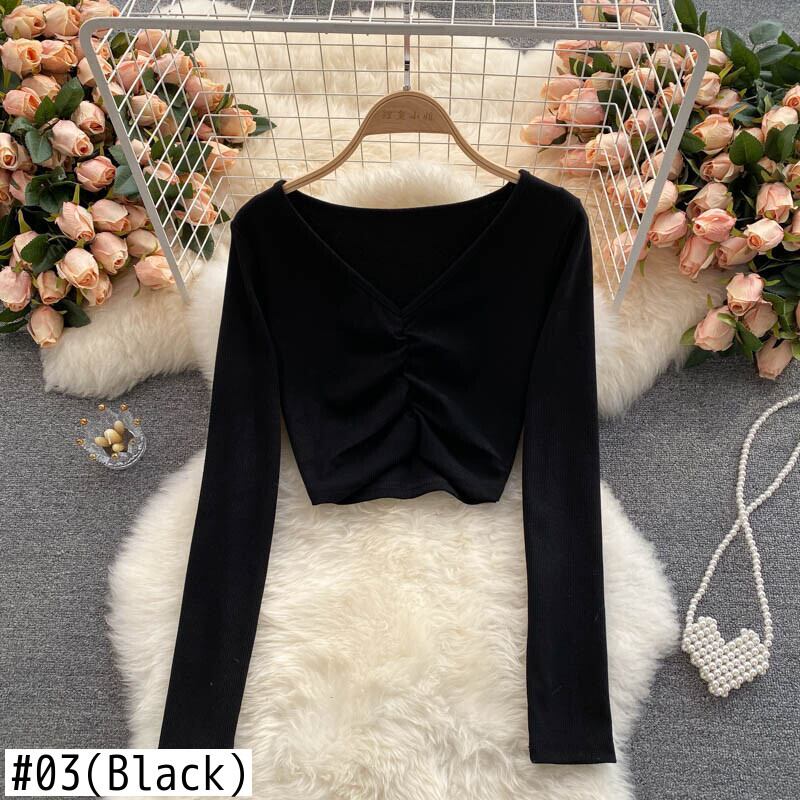 女性ブラウスシャーリングVネック長袖ソリッドスリムトップス2021秋のストリートウェアショートブラウス ロング オータム 秋物 ソリッドカラー