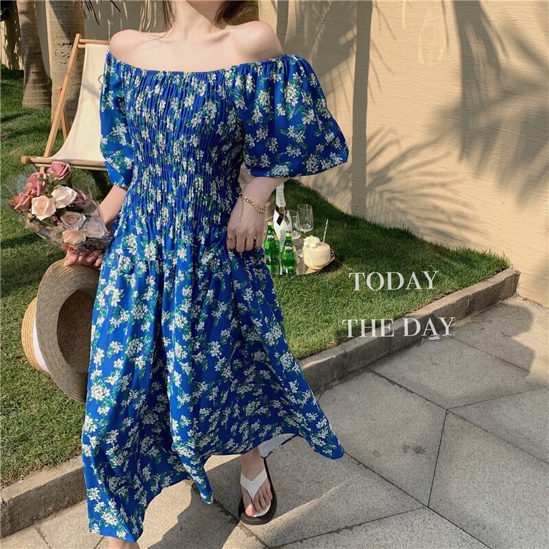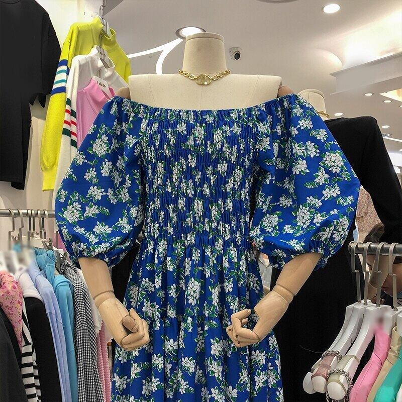 2021年夏の女性のセクシーなスラッシュネックプリントシフォンAラインドレスレディヴィンテージ服Vestidos サマー 夏物 ビンテージ