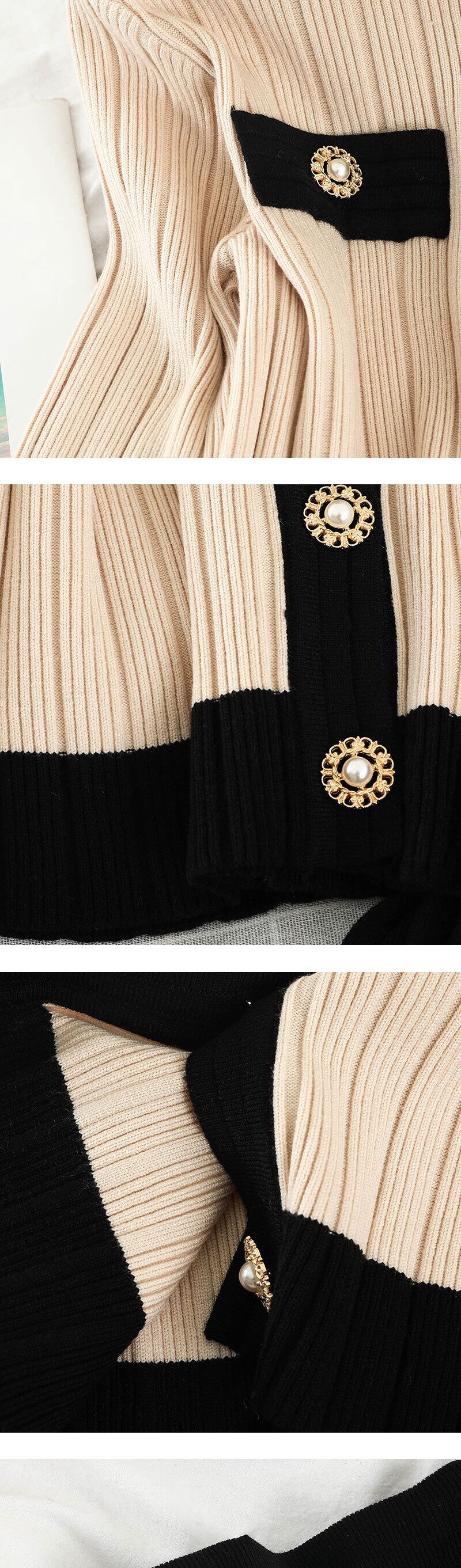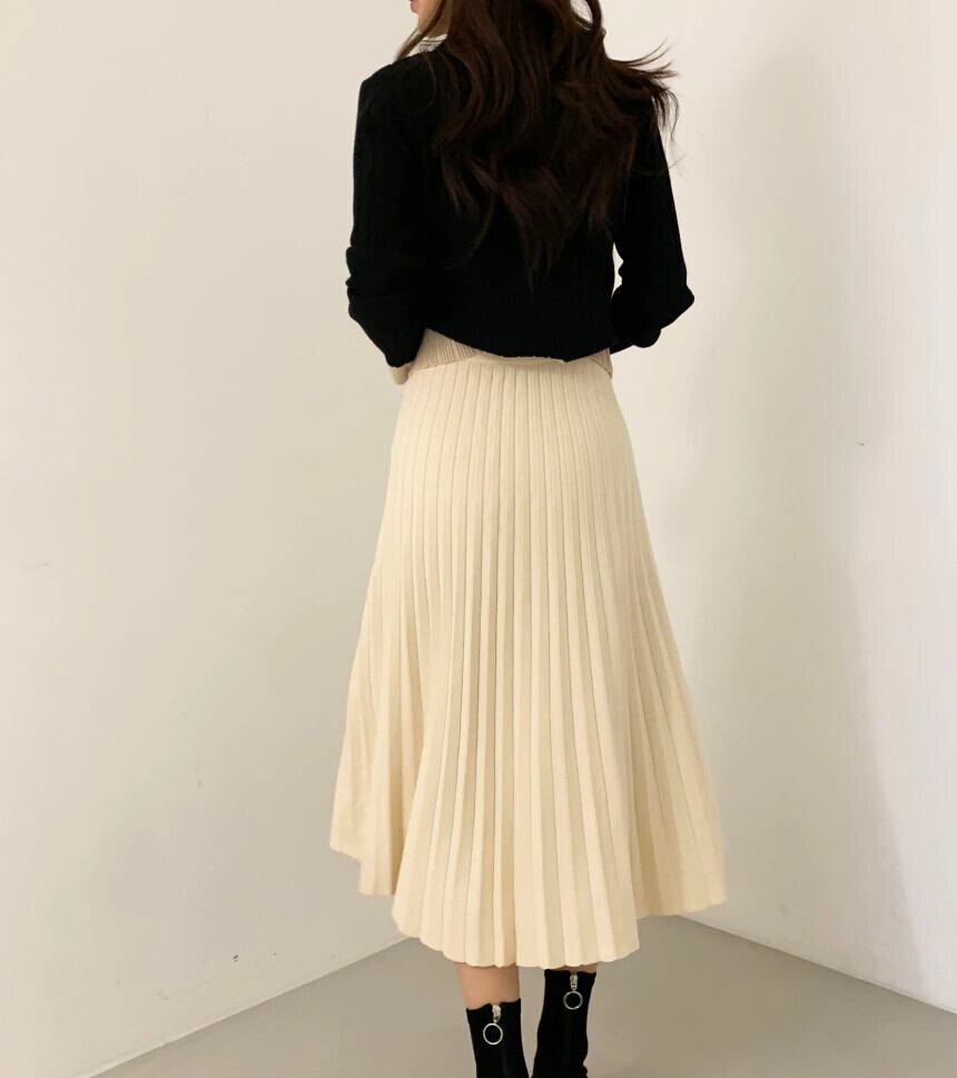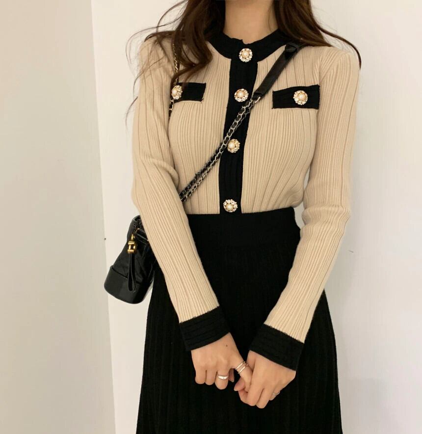 ヴィンテージニット2ピーススカートスーツセット女性シングルブレストパールボタンカーディガン+プリーツロングスカートスーツ 真珠 ビンテージ