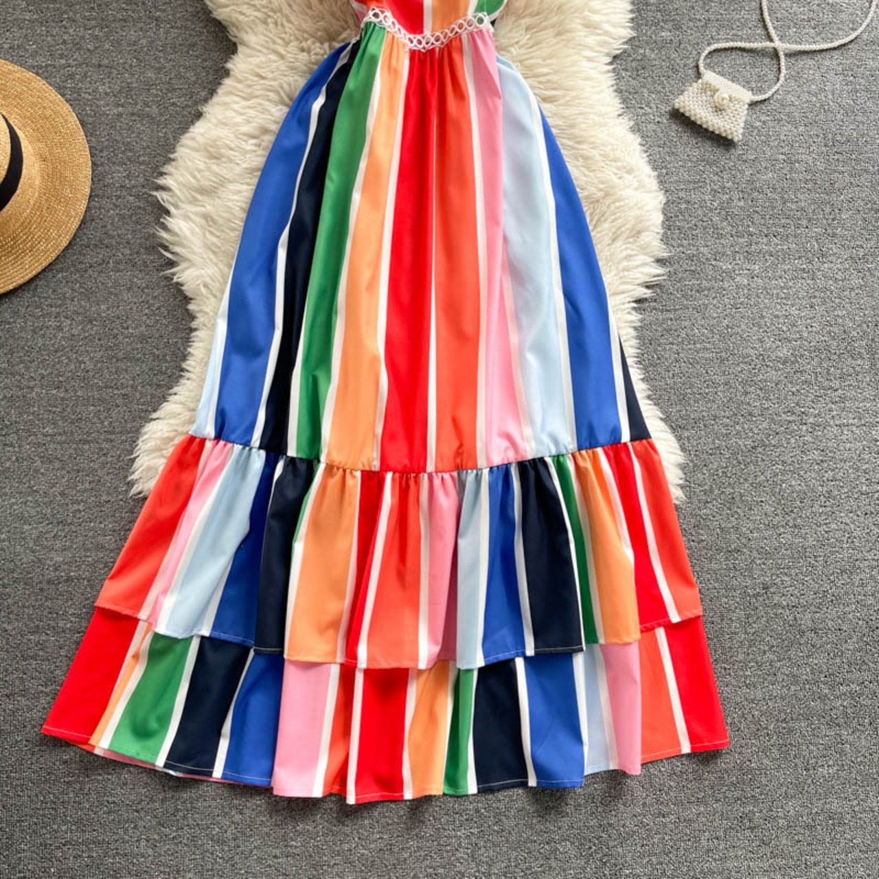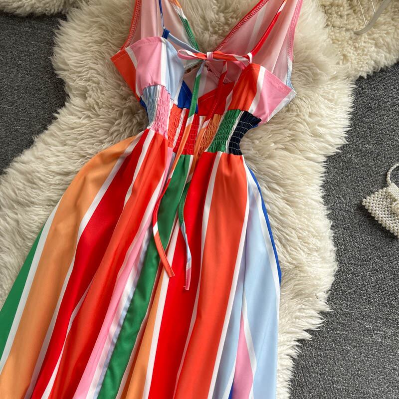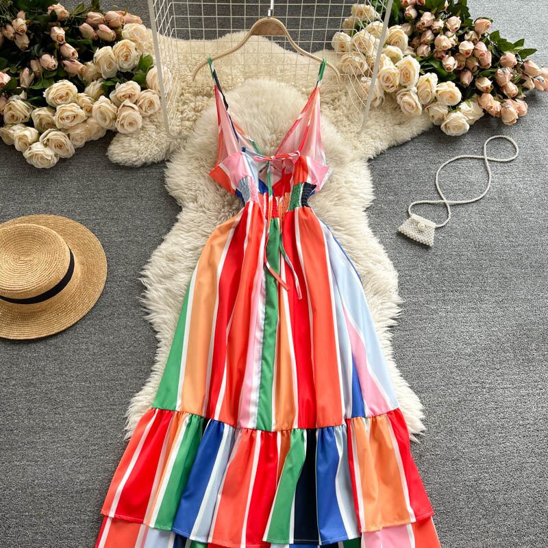 レインボーストライプカラーマッチスパゲッティストラップロングマキシドレス自由奔放に生きるディープVネックレースアップバックレスフリルホリデードレス ラッフル