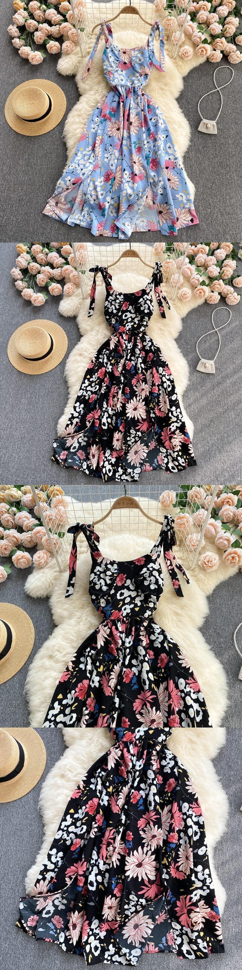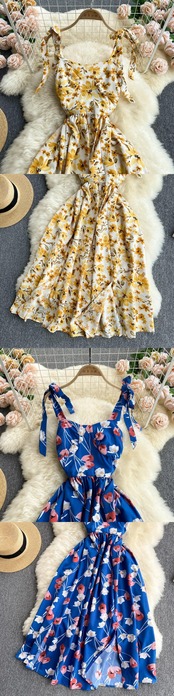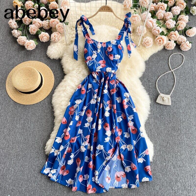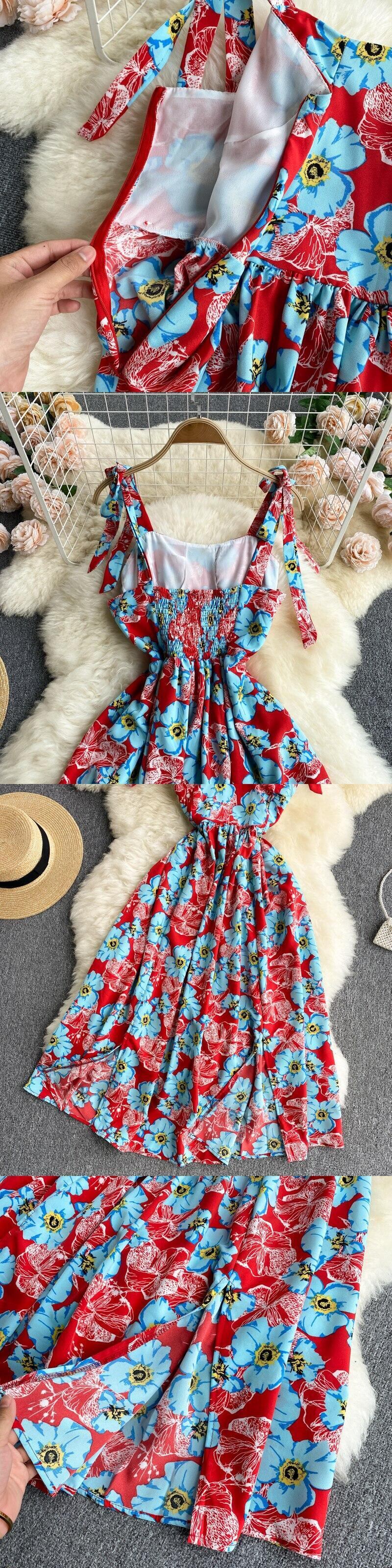 女性のプリントストラップドレスセクシーなノースリーブ弾性シャーリングAラインドレス夏のボヘミアンプリントスプリットビーチサンドレス エラスティック 伸縮 サマー 夏物