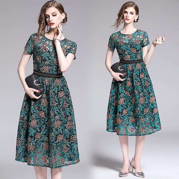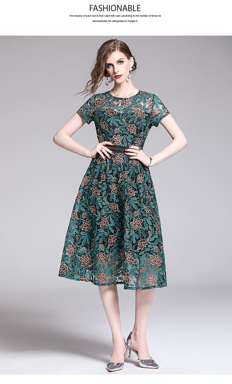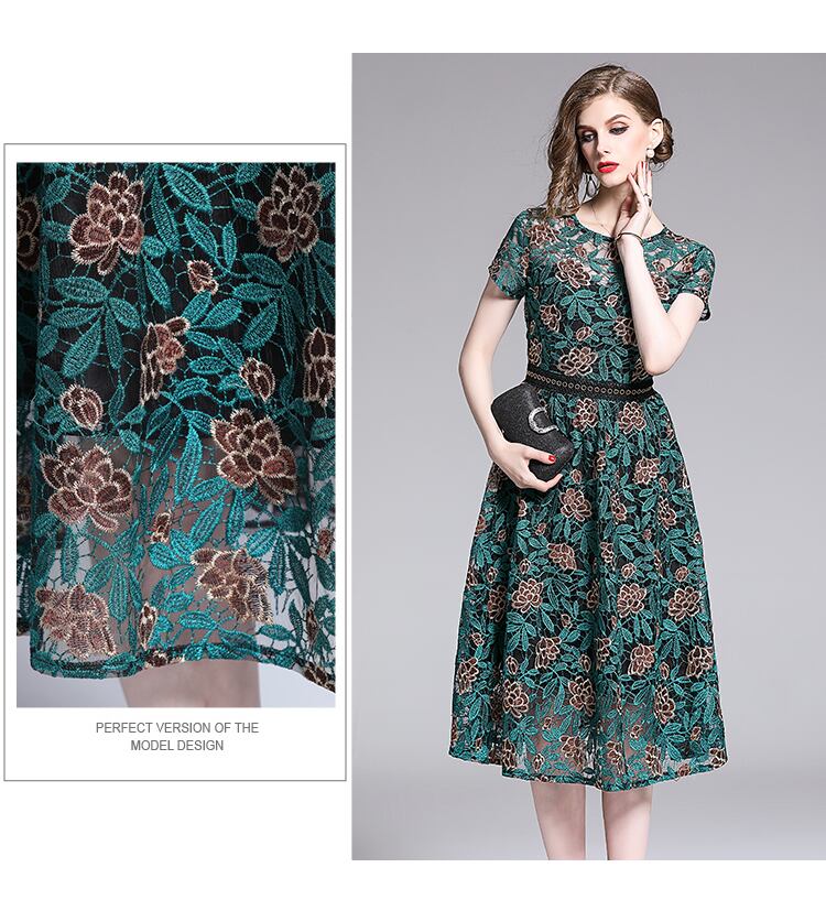 プラスサイズサマーレースドレスヴィンテージ女性花刺繡半袖ミディ中空アウトドレス ショート ハーフスリーブ 刺繍 大きめサイズ 夏物 花柄 ビンテージ