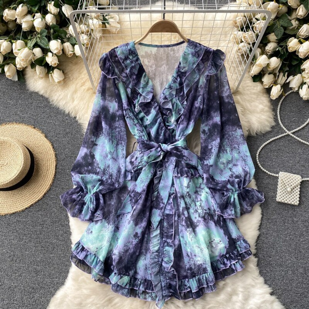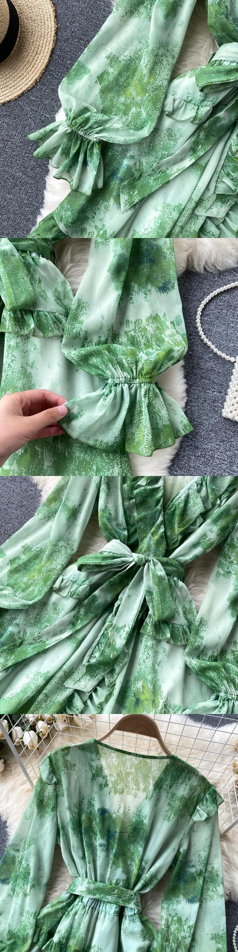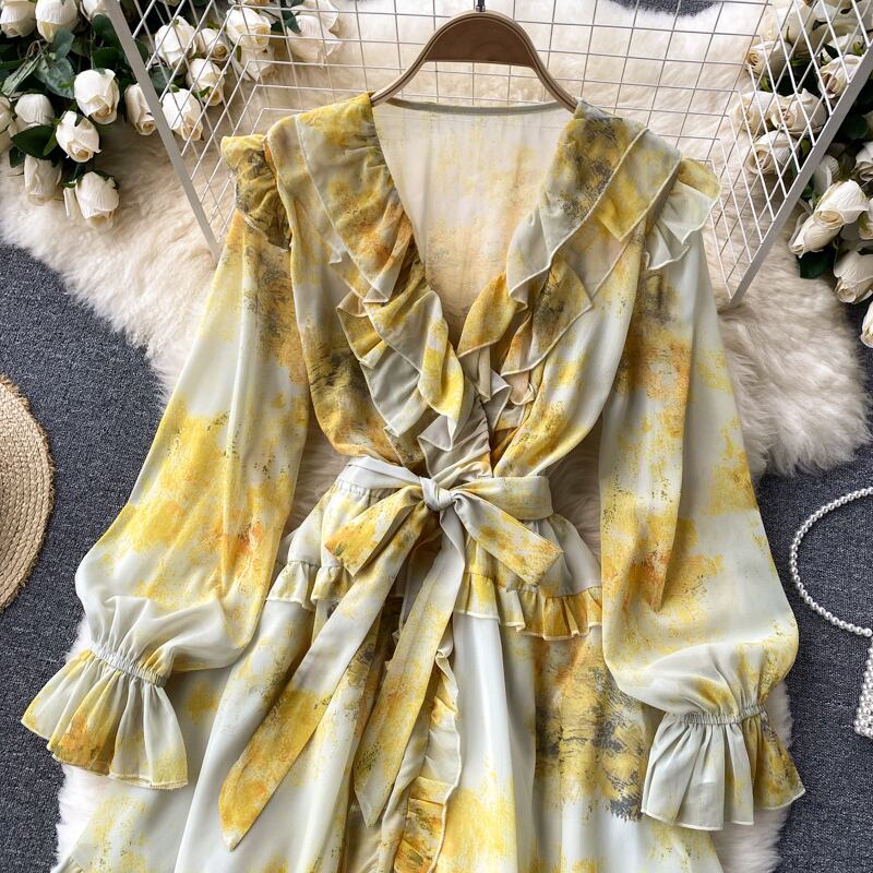 女性レトロプリントドレス長袖VネックAラインドレス秋の自由奔放に生きる休暇フリルショートドレス ロング ラッフル オータム 秋物