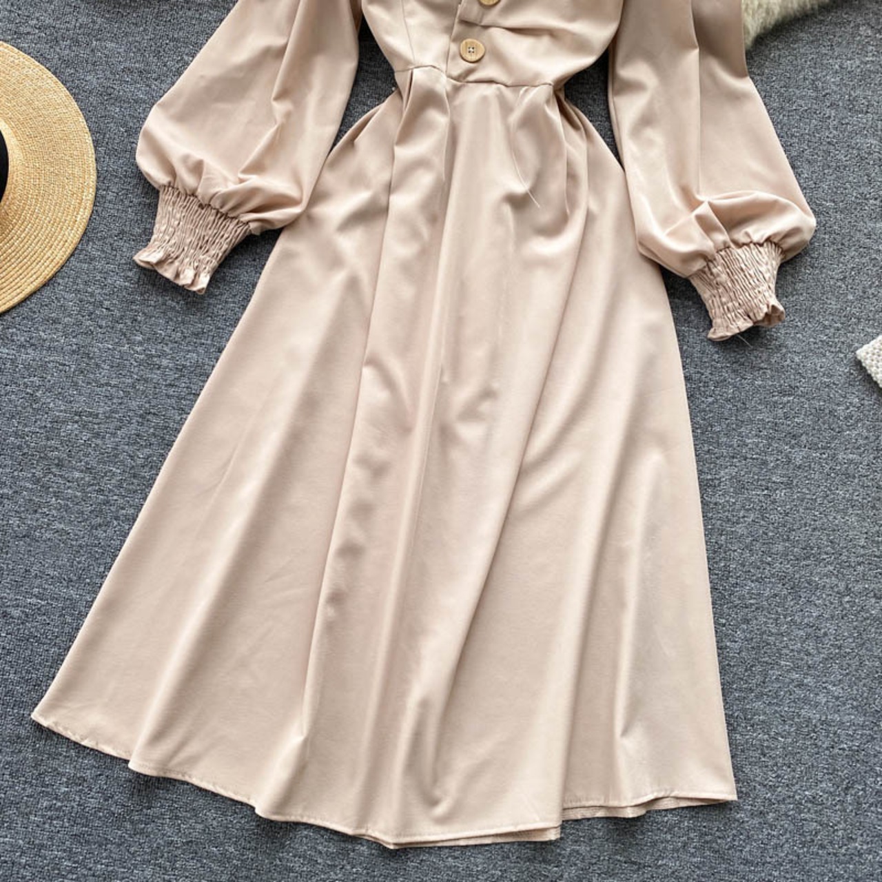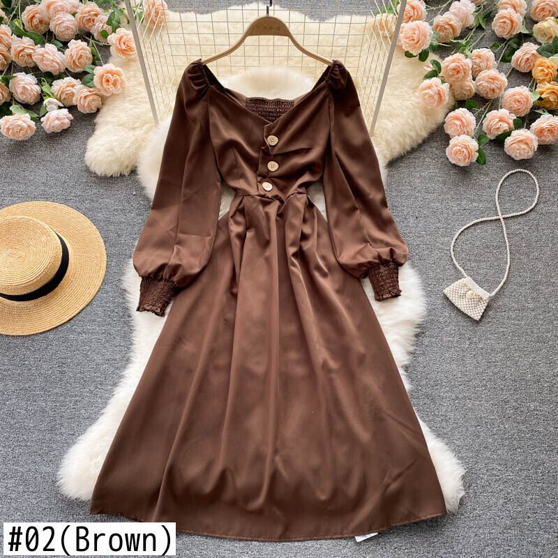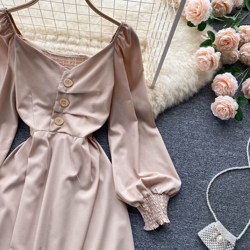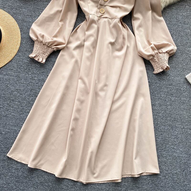 女性フレンチドレス長袖Vネック伸縮性シャーリングAラインドレス秋のストリートウェアミディドレス ロング エラスティック オータム 秋物