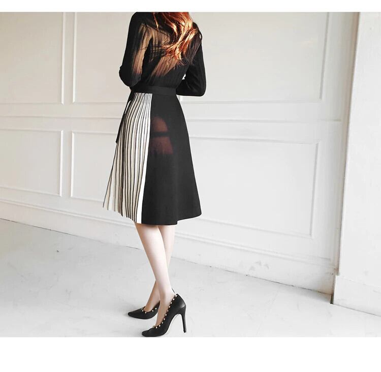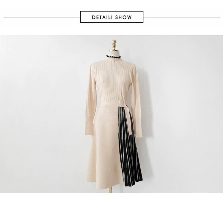 2021年秋スタイルの女性スタンドカラー長袖気質パッチワークニットセーターAラインドレス ロング オータム 秋物