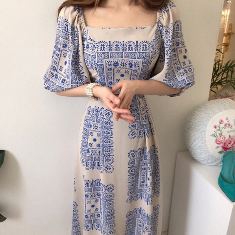 夏の女性のヴィンテージルーズウエストスリムは薄いスクエアカラーのHirカラーマキシドレスでした サマー 夏物 スクウェア ビンテージ
