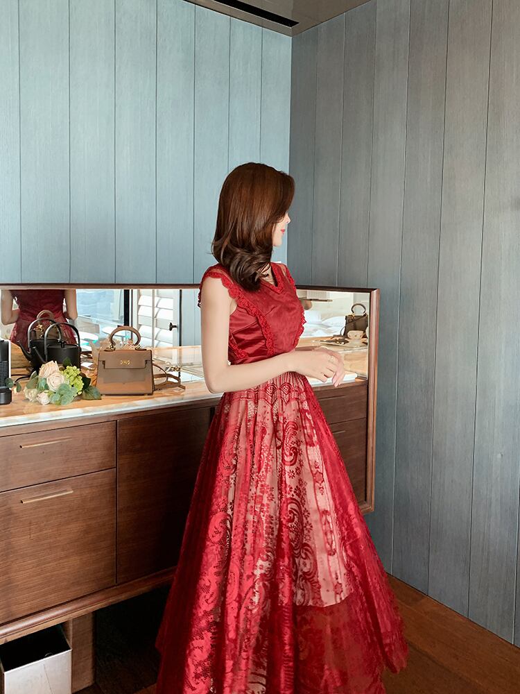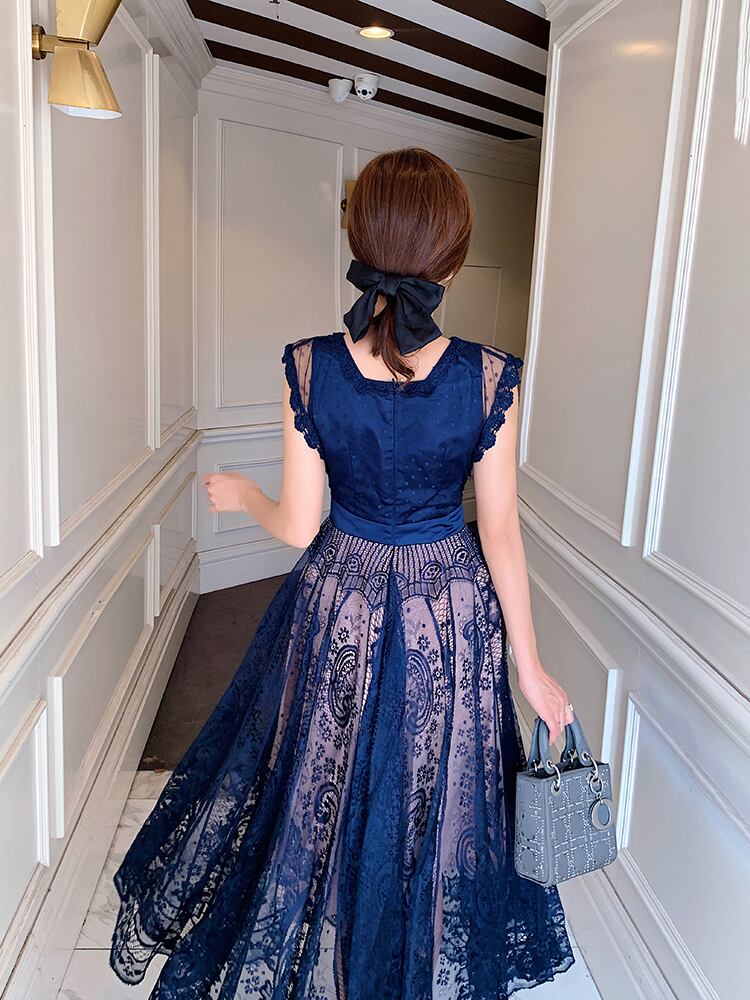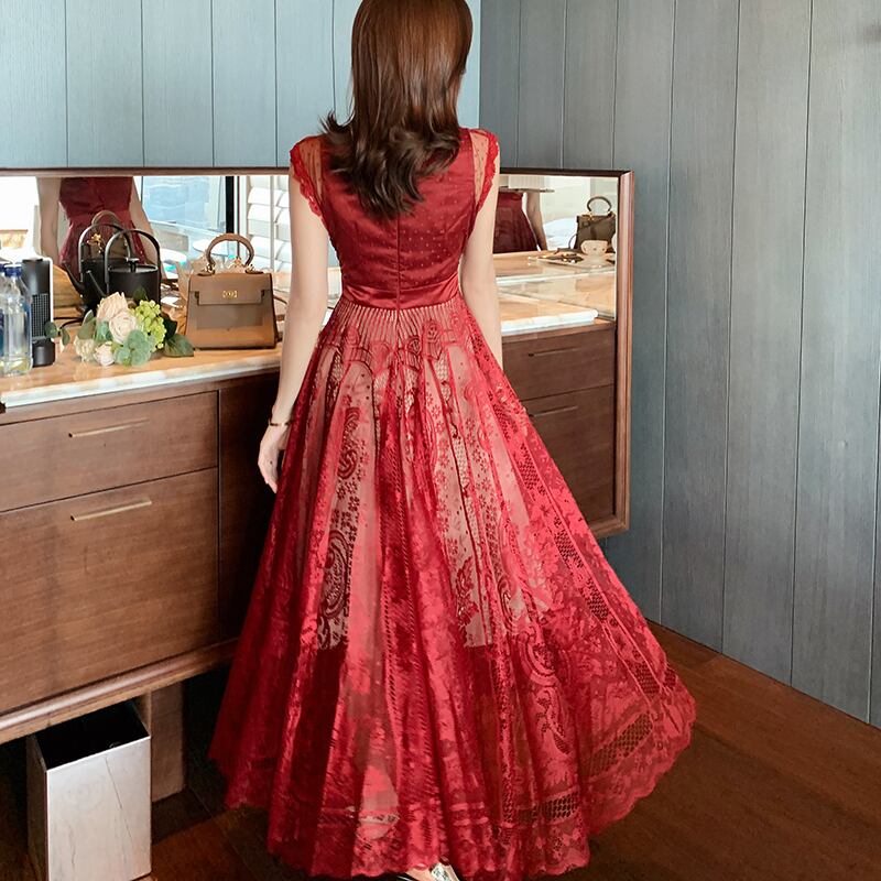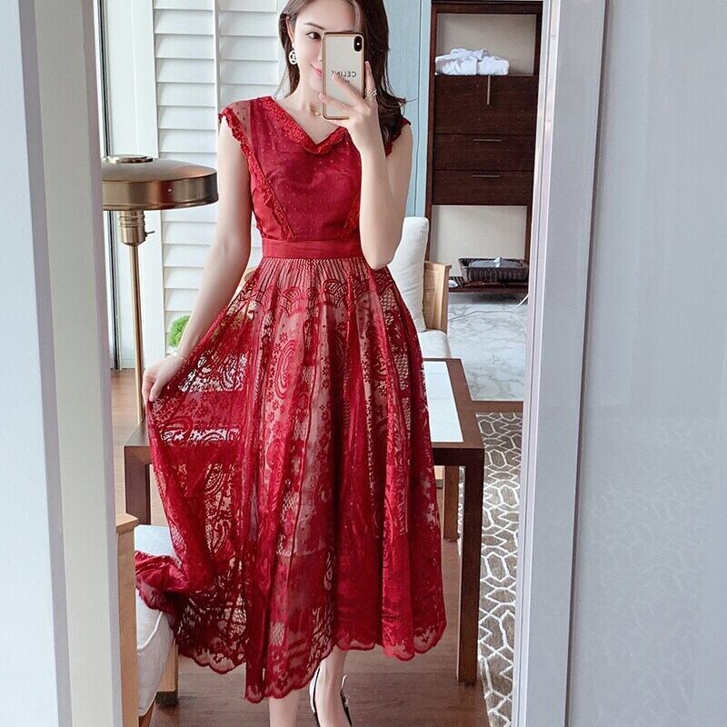夏のノースリーブパッチワークレースドレス2021夏の滑走路の女性セクシーなVネック刺繡花ミディパーティードレス服 刺繍 サマー 夏物 花柄