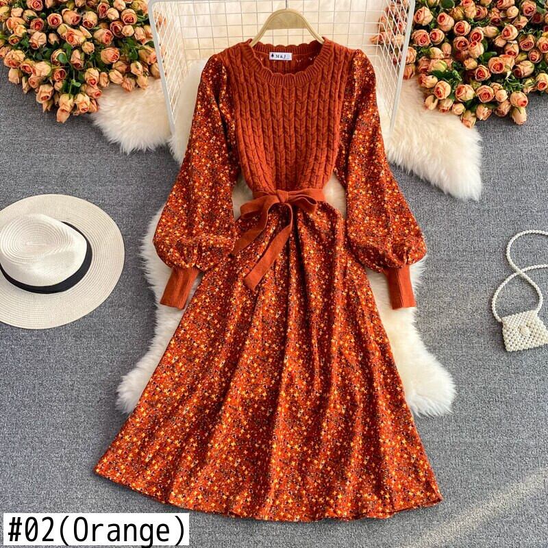 女性レトロフローラルドレスニットスプライスOネック長袖Aラインドレス秋冬ストリートウェアドレス ロング オータム 秋物 ウィンター 冬物 花柄
