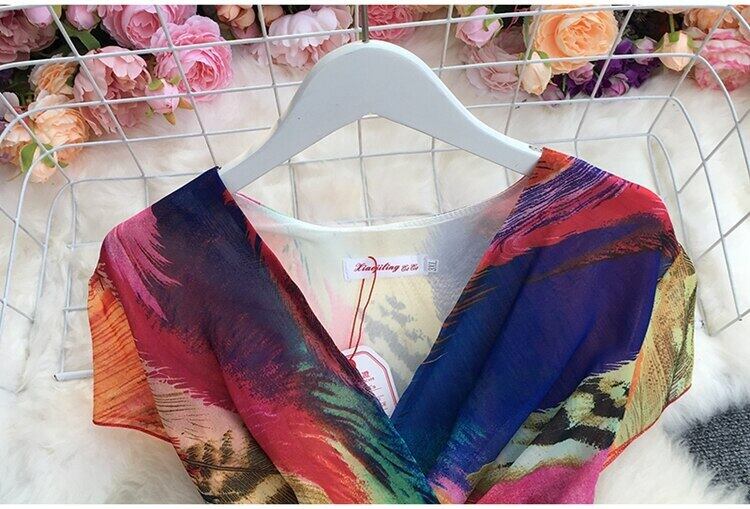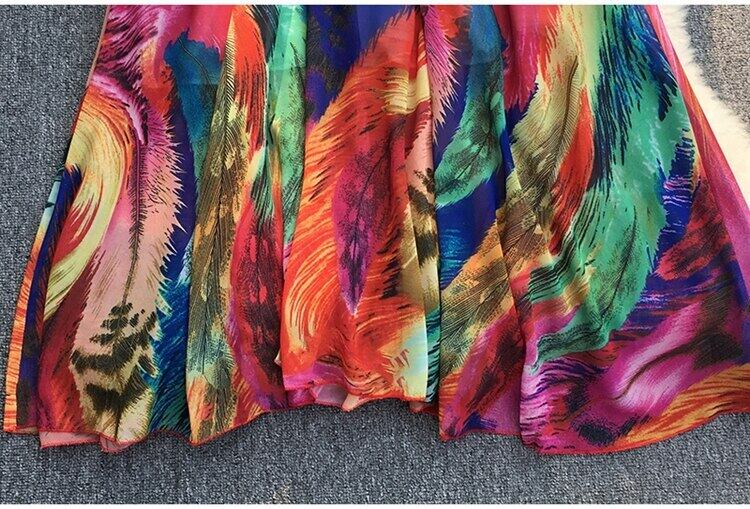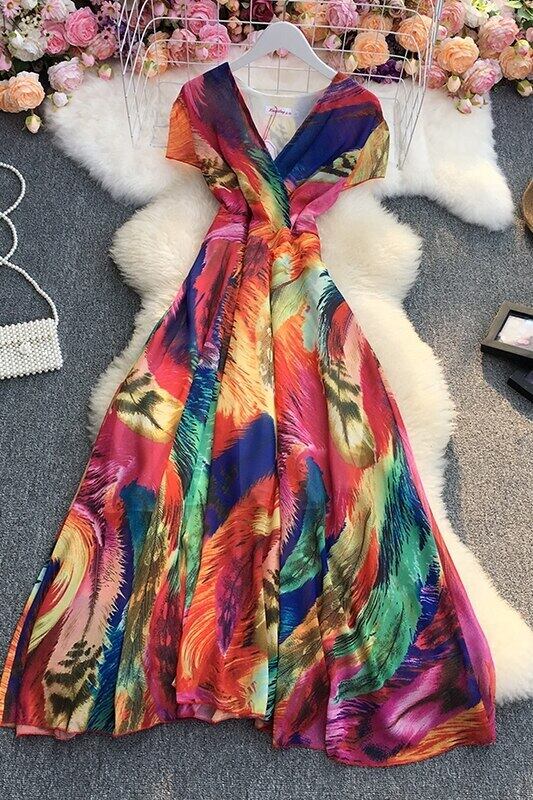 2021年夏ボヘミアンVネック半袖ワンピースハイウエストプリーツウエストプリントロングAラインビッグスカートシフォンワンピース ハイウェスト ショート ハーフスリーブ サマー 夏物