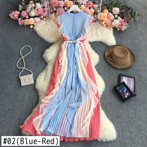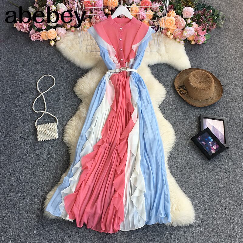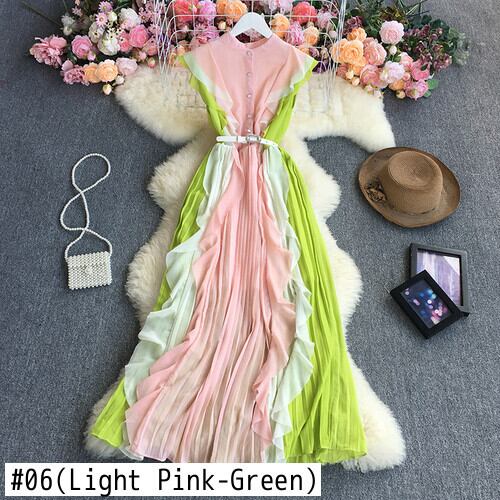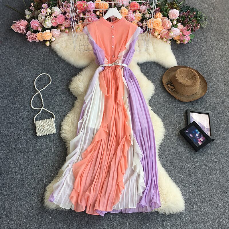 2021年夏の気質スタンド襟ノースリーブワンピースフリルシングルブレストハイウエストプリーツロングAラインワンピース ハイウェスト ラッフル サマー 夏物