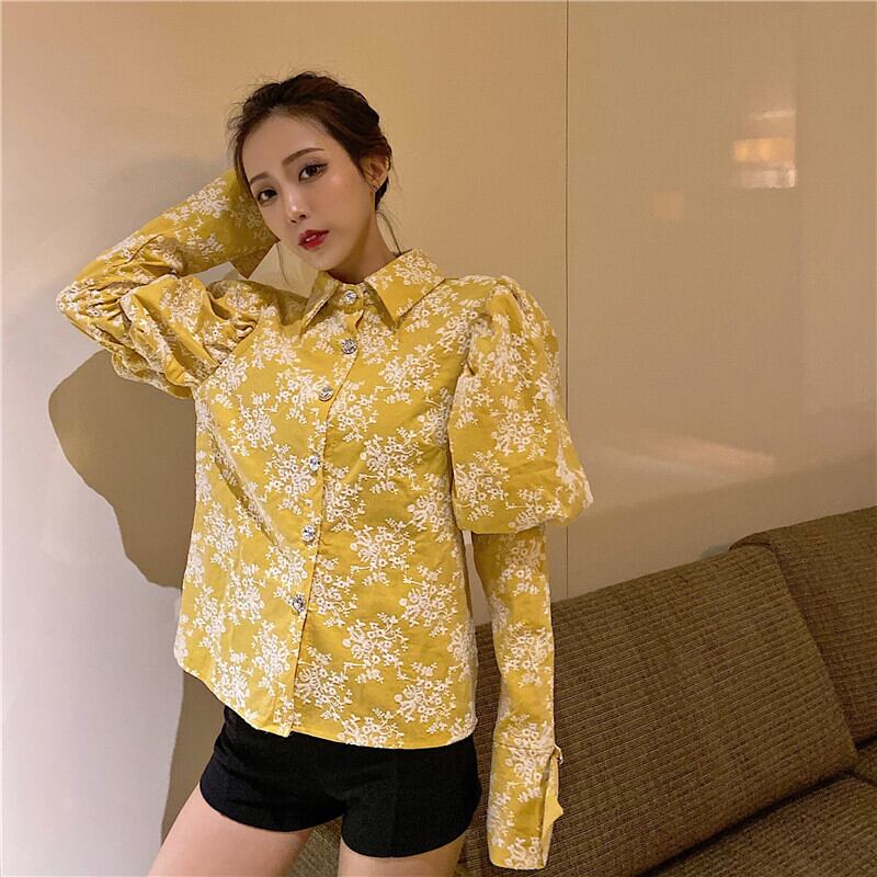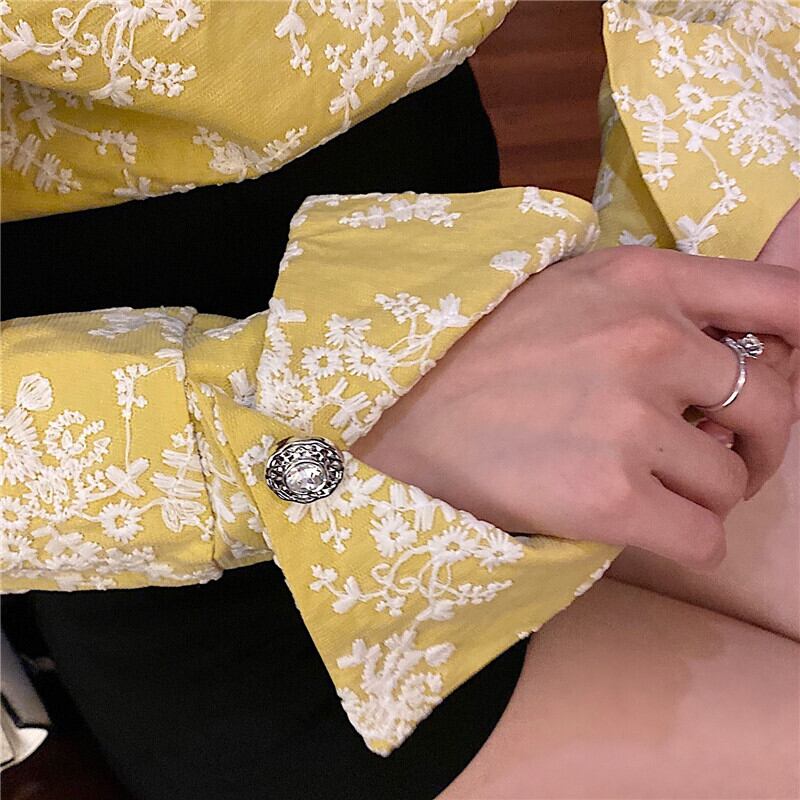 ランウェイフローラル刺繍ブラウスシャツレディースパフ長袖ヴィンテージ 春シングルブレストスリムトップス ロング スプリング 春物 花柄 ビンテージ