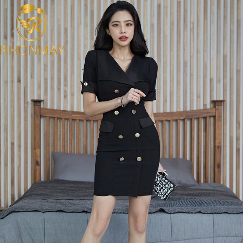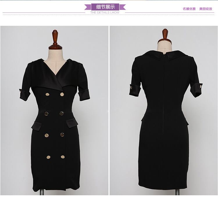 オフィスダブルブレストドレス夏の女性黒半袖ボディコン鉛筆OLドレスセクシーなVネックワークVestidos ショート ブラック ハーフスリーブ サマー 夏物 会社 学校 通勤や通学にも