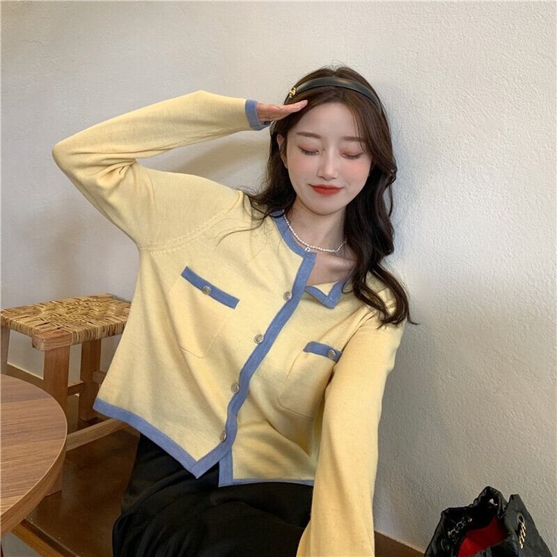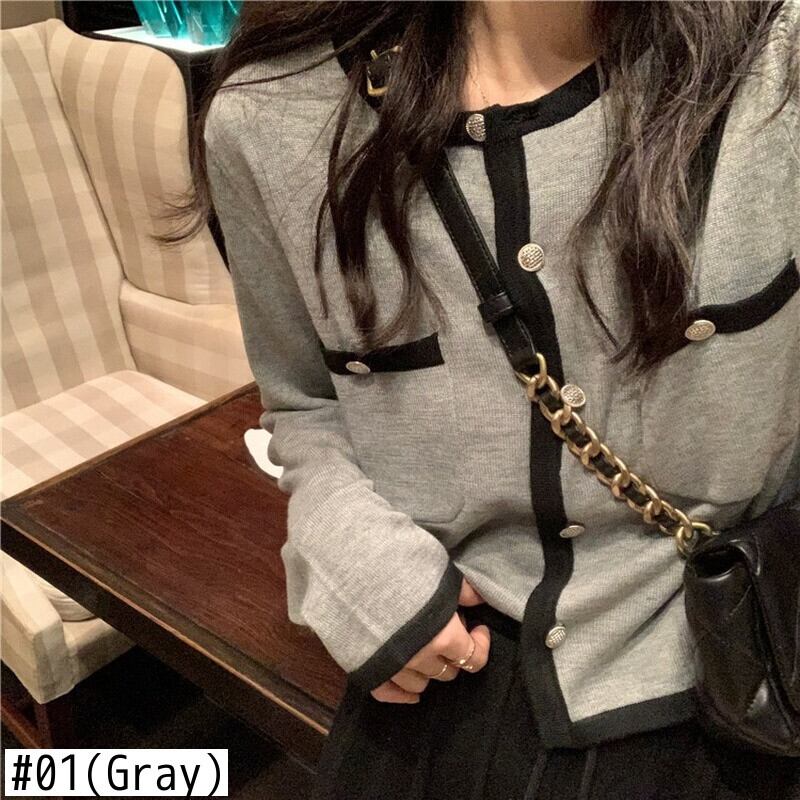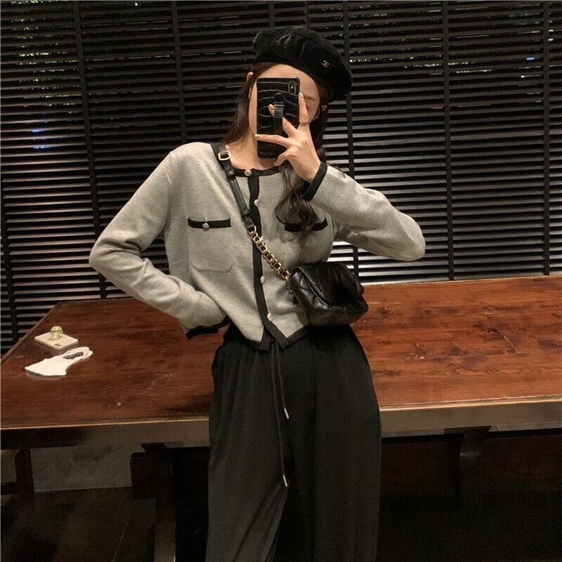 ニットカーディガンレディースOネック長袖2021年秋ルーズクロップドセーターコントラストアウトウェアシック ロング オータム 秋物