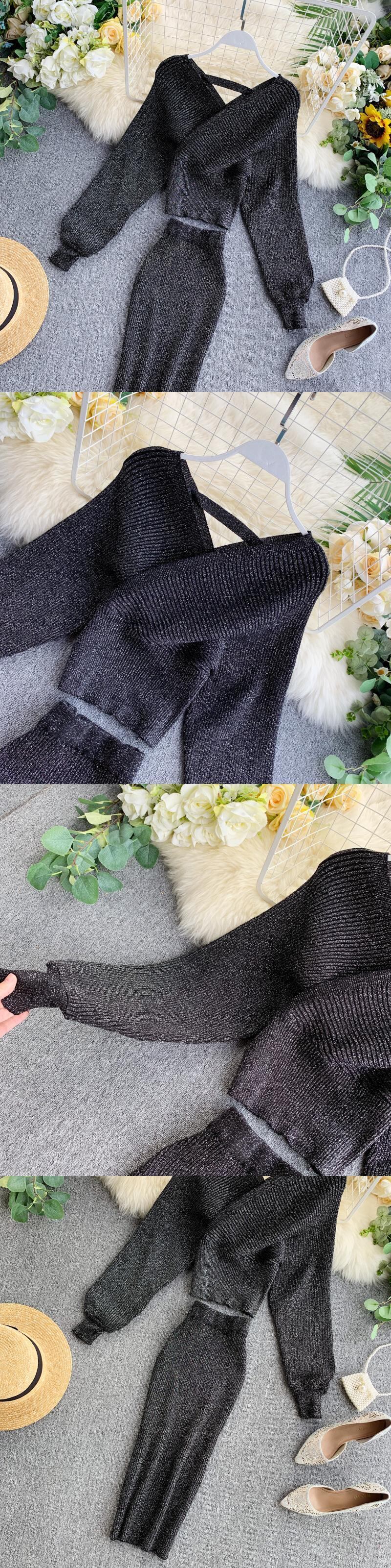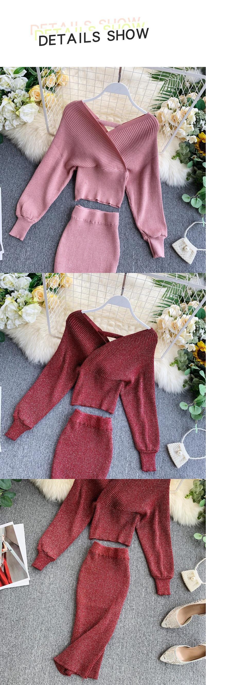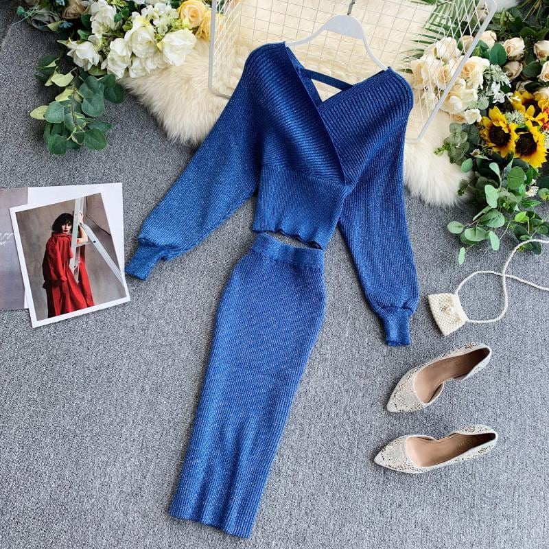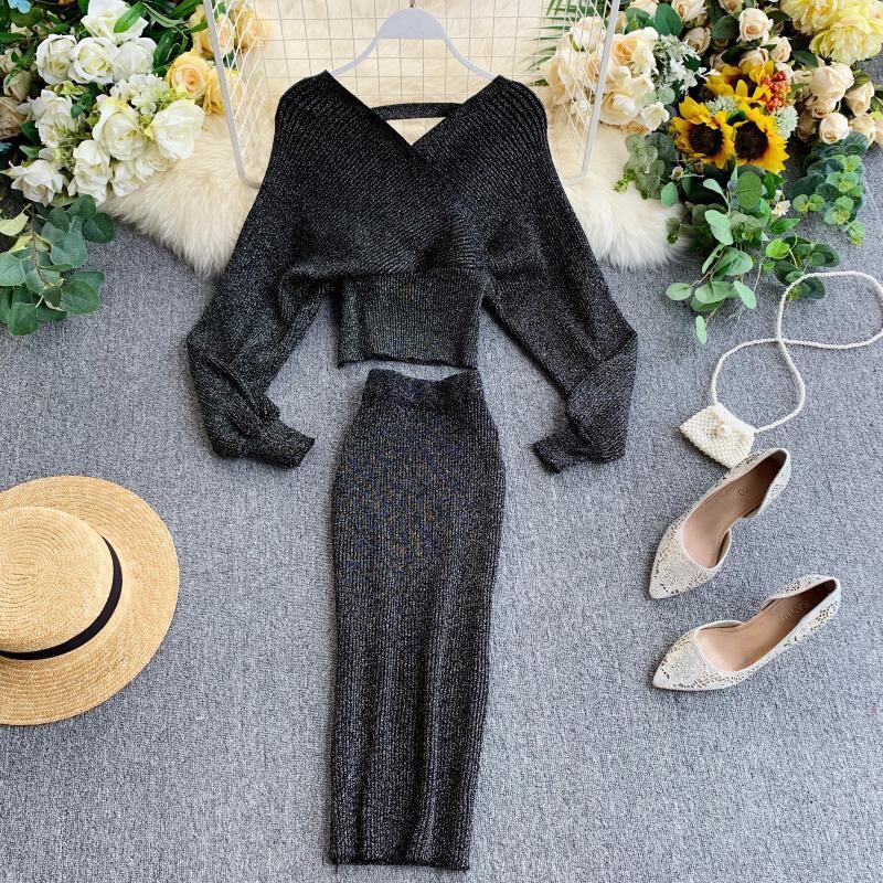 女性秋冬編み物パーティーツーピースセットVネックロングバットスリーブセーター+ウエスト伸縮性スリムボディコンスカート エラスティック オータム 秋物 ウィンター 冬物