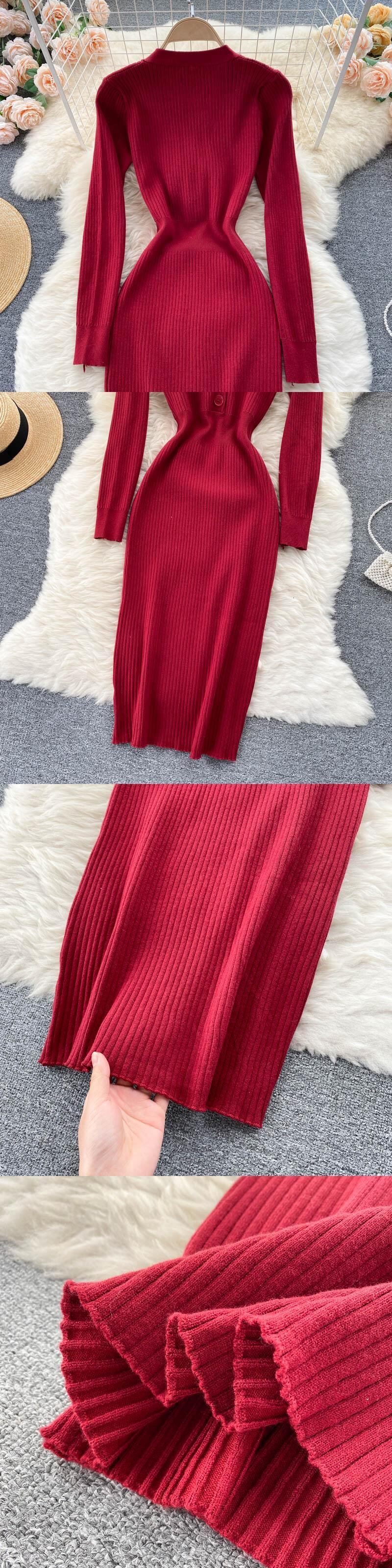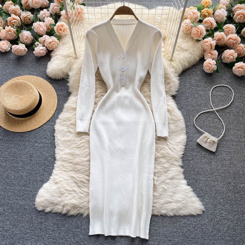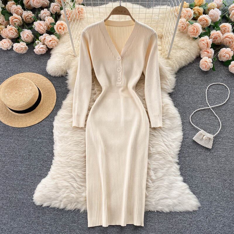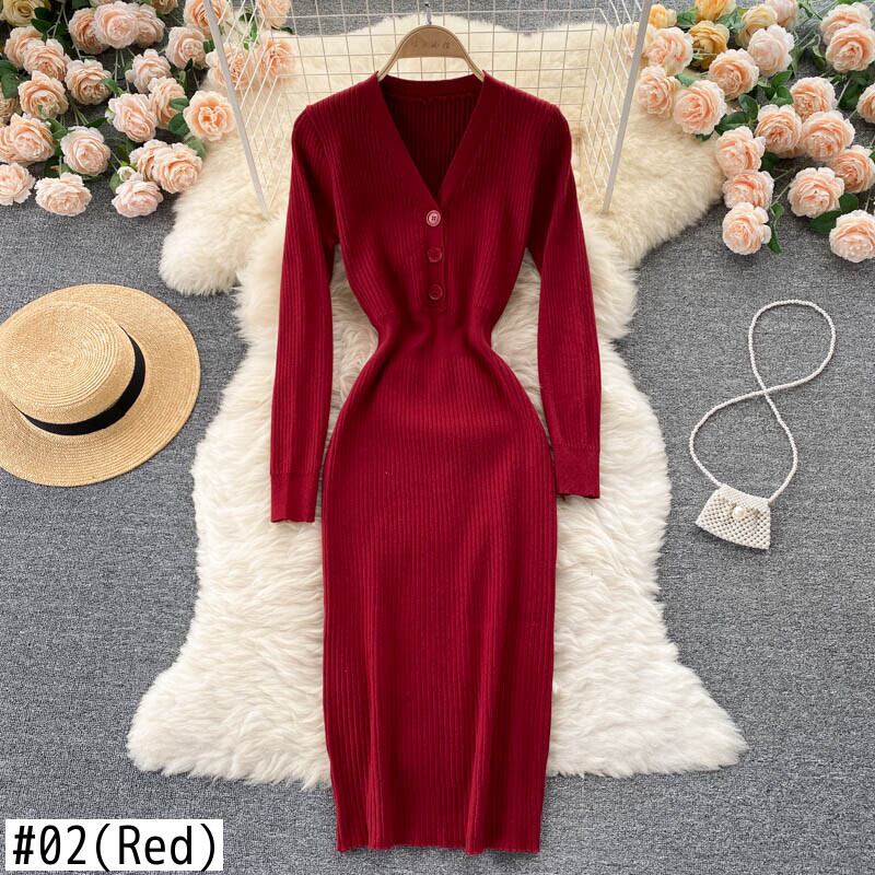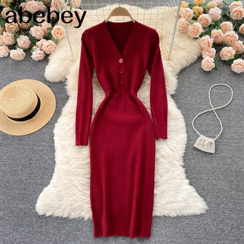 女性ニットドレス長袖Vネック伸縮性スリムペンシルドレス秋冬暖かいボディコンセータードレス ロング エラスティック オータム 秋物 ウィンター 冬物