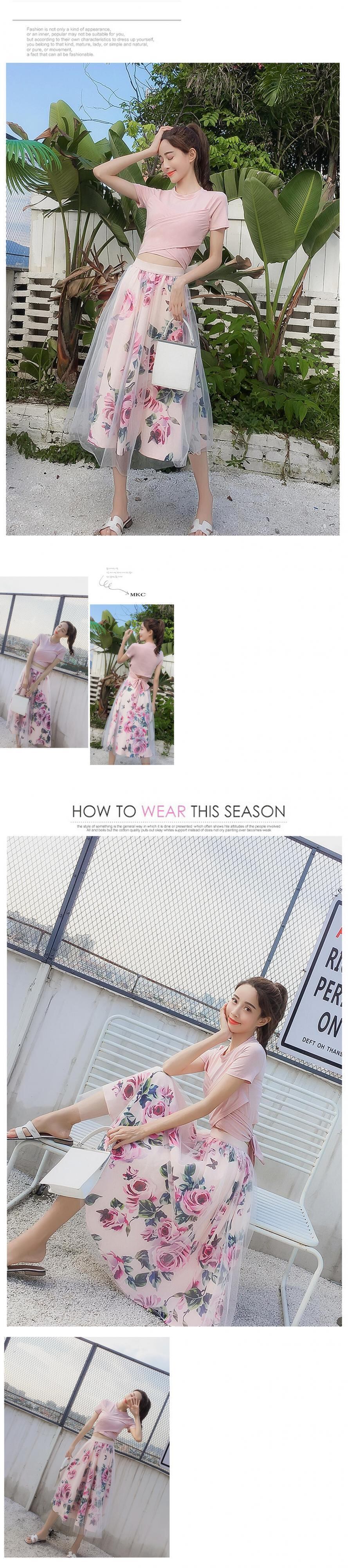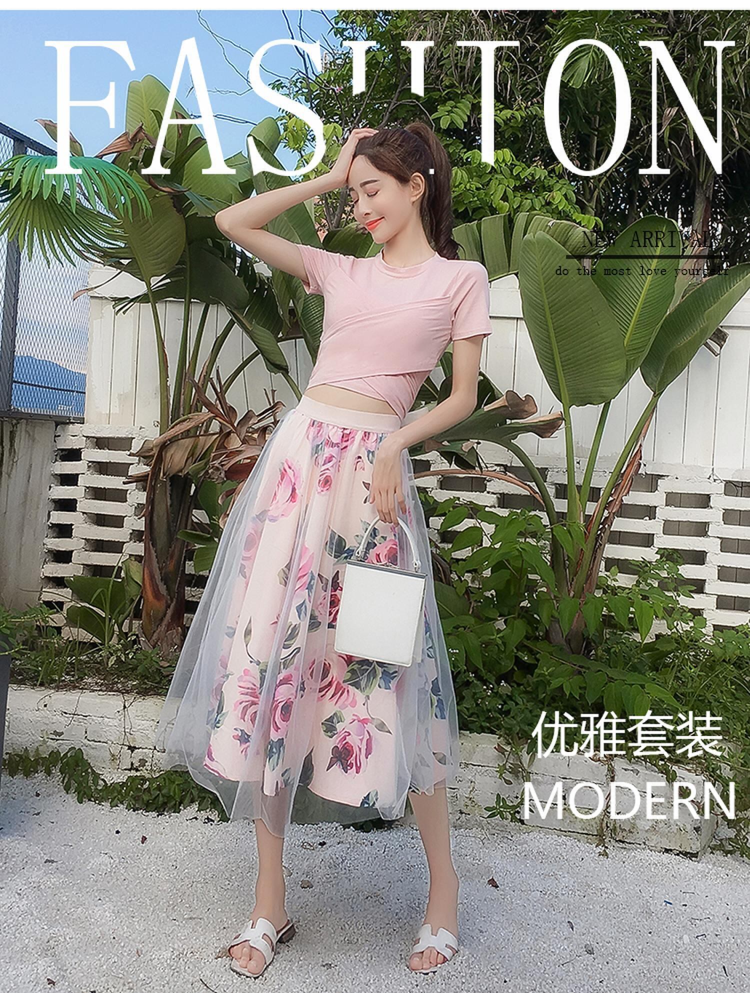 高品質の女性不規則なTシャツ+メッシュスカートスーツ蝶結びソリッドトップスヴィンテージフローラルスカートセット女性ツーピースセット リボン 花柄 ソリッドカラー ビンテージ