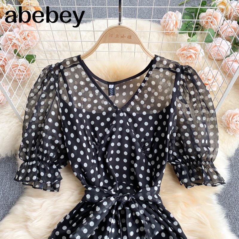 女性フレンチドットドレスパフスリーブVネックサッシAラインパーティードレスサマーストリートウェアフリルロングサンドレス ラッフル 夏物