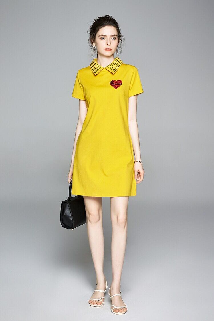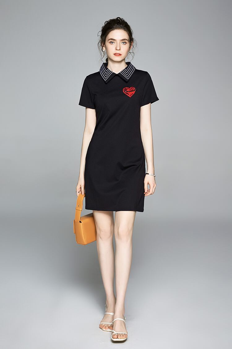 サマーブラックドレスターンダウンカラー半袖スリムラブ刺繡ブローチレディースミニドレス ショート ハーフスリーブ 刺繍 夏物