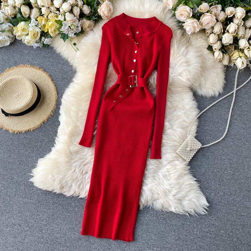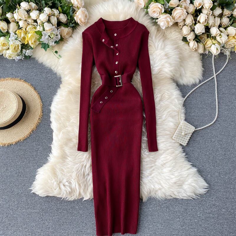 伸縮性ニット女性ドレスOネックブレストレースアップ長袖シースドレス秋冬暖かいスリムトリコットドレス ロング エラスティック オータム 秋物 ウィンター 冬物