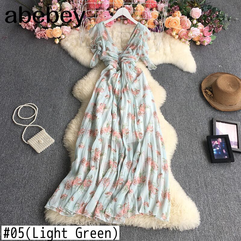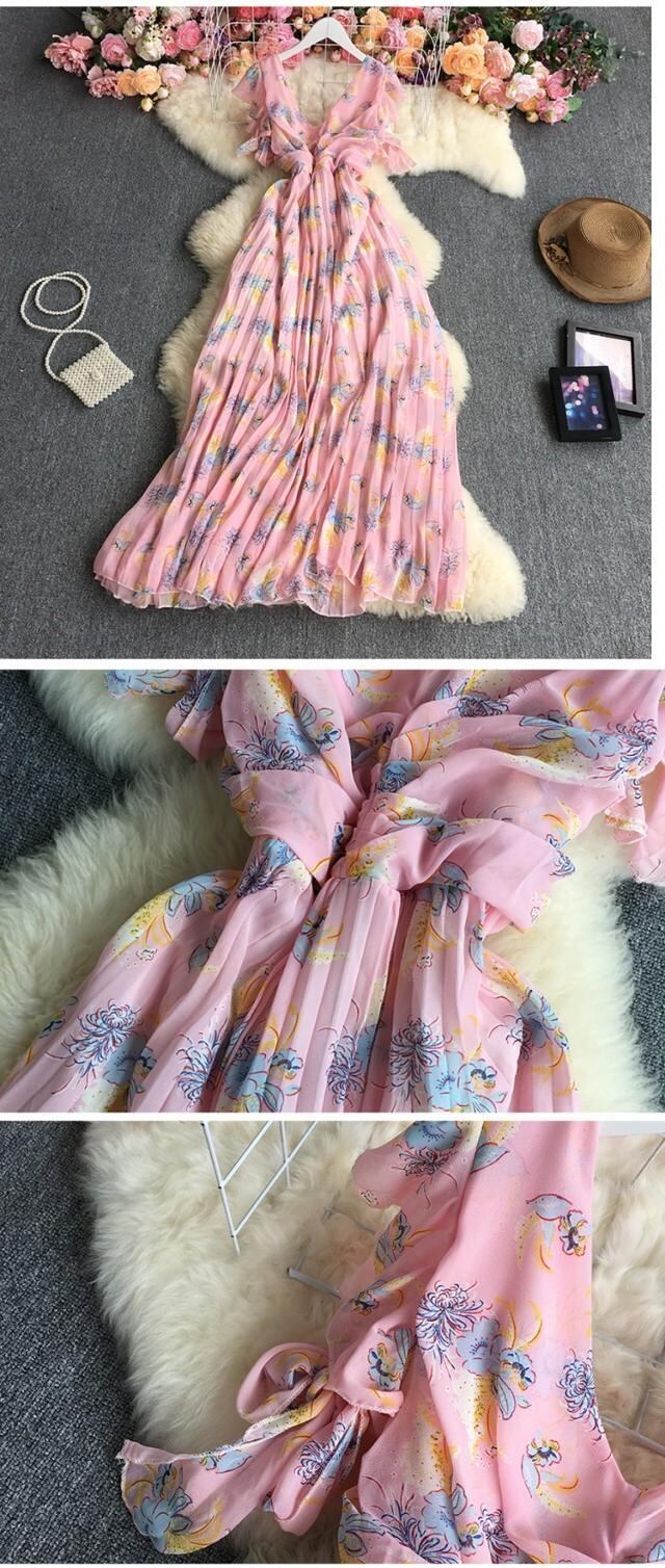2021年夏の女性気質VネックフライングスリーブドレスハイウエストプリーツプリントロングAラインビッグスカートドレス ハイウェスト サマー 夏物