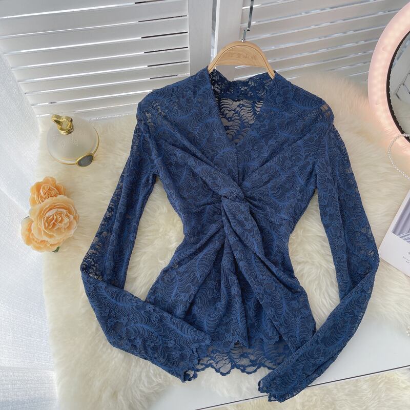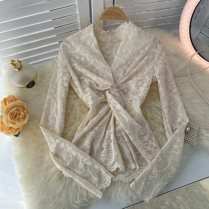 女性フレンチレースブラウス長袖Vネックソリッドセクシースリムトップス2021秋のストリートウェアブラウス ロング オータム 秋物 ソリッドカラー