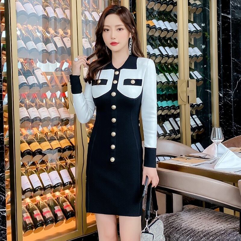 女性長袖シングルブレスト対照的な色セータージャンパースリムニットドレス ロング