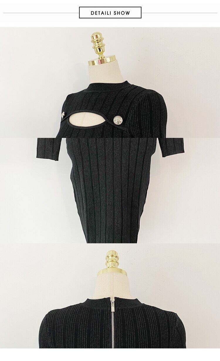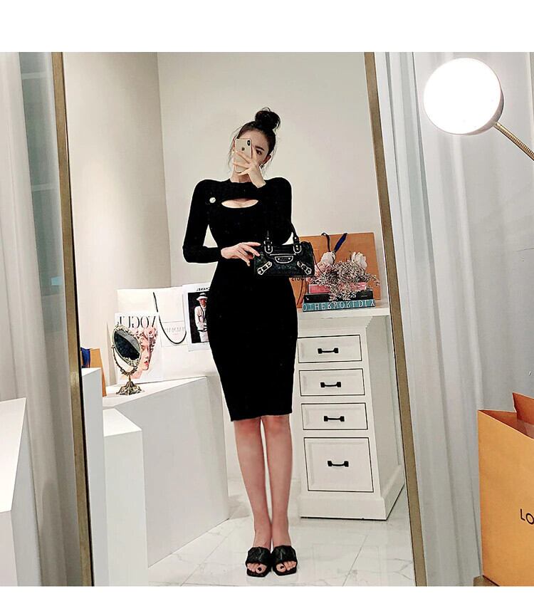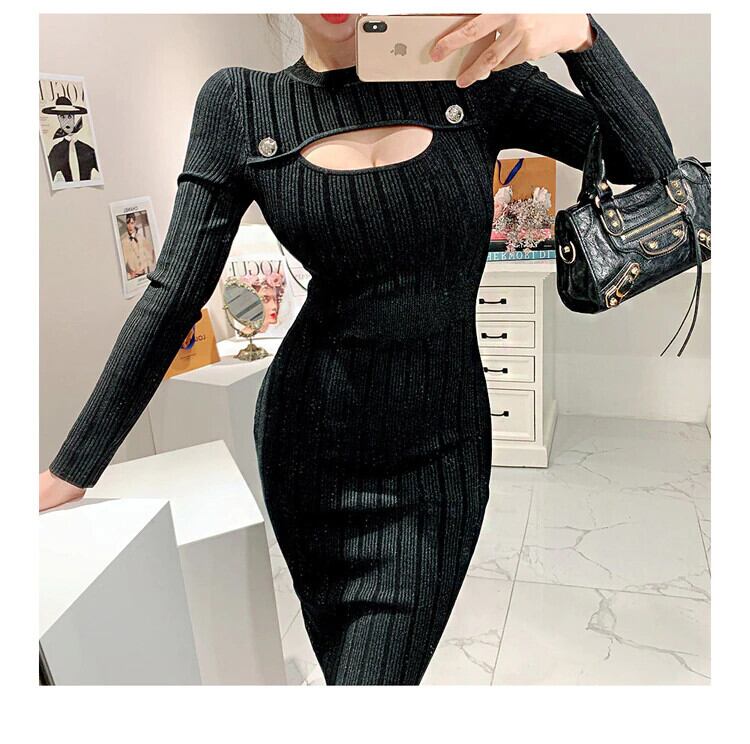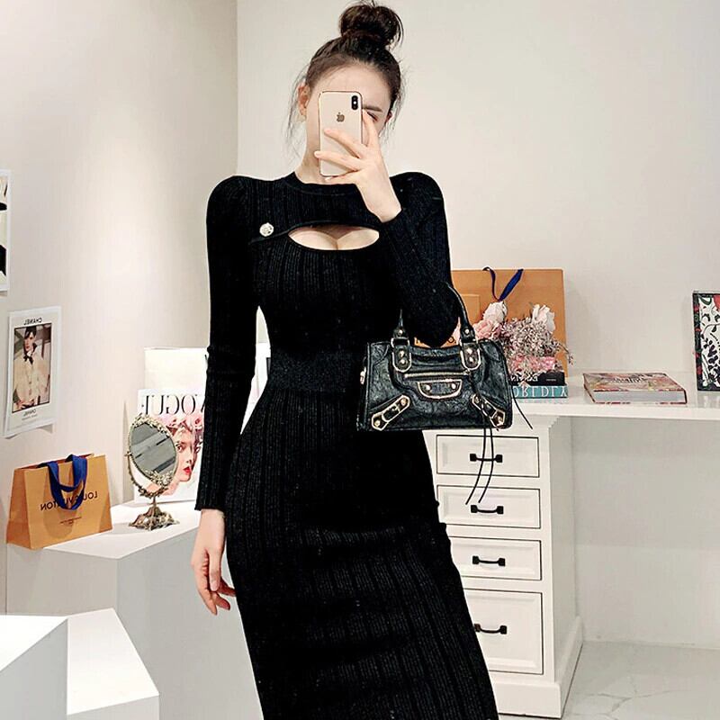 女性セクシーな編み物黒のドレス長袖Oネック中空アウト膝丈パーティードレスレディドレス ロング ブラック