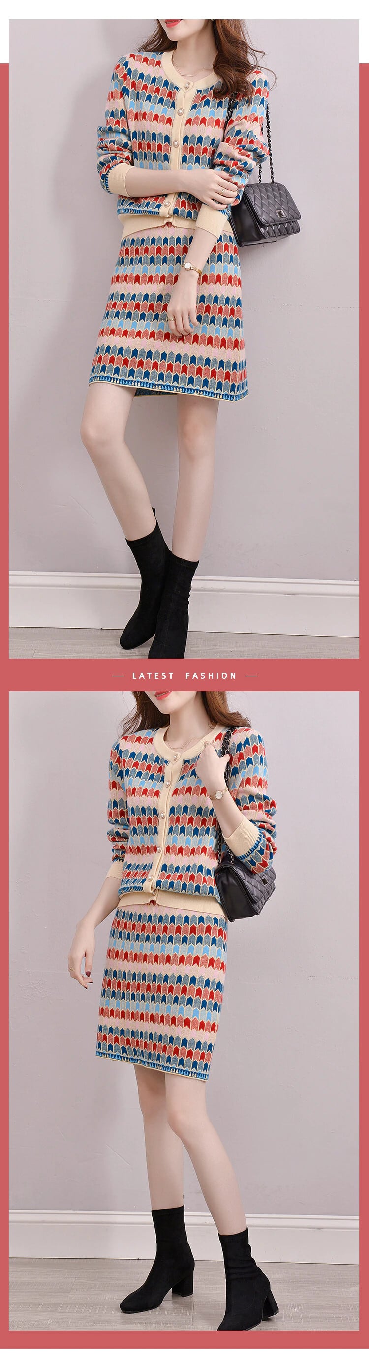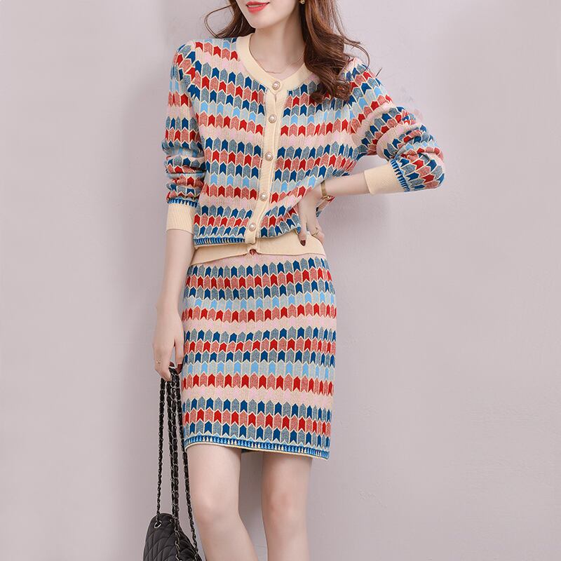 ランウェイの2ピースセットチェック柄ニットセーターセットレディースサマーOネック長袖トップ+ミニAラインスカートスーツ ロング 夏物