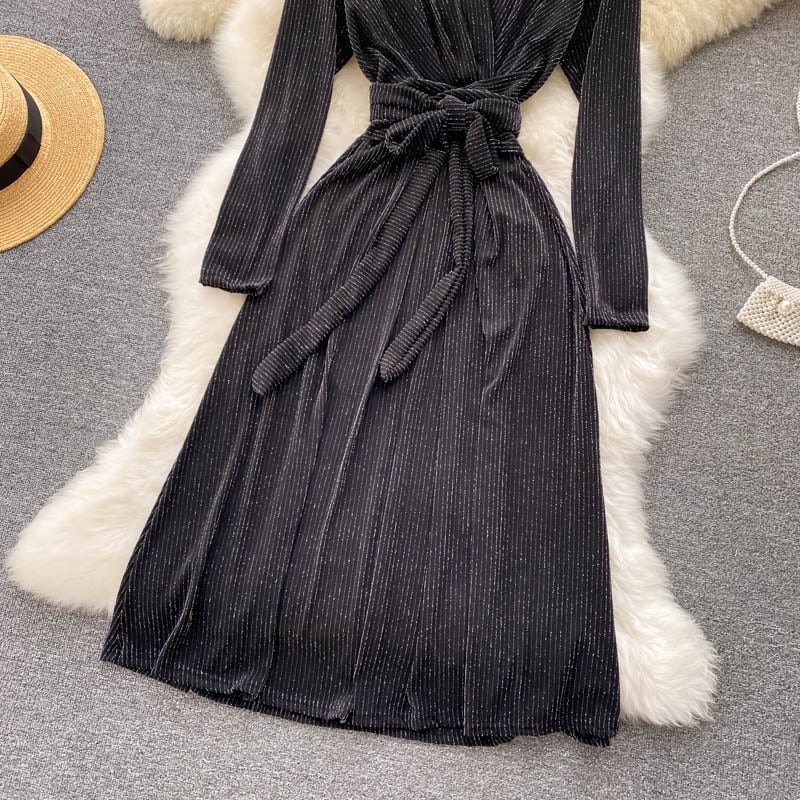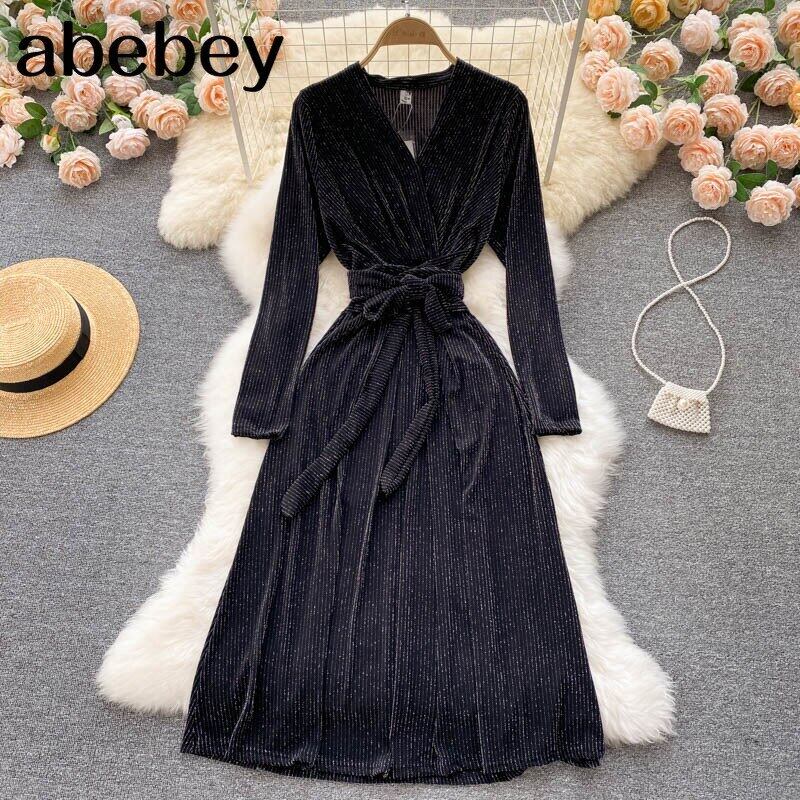 女性レトロベロアドレス長袖VネックAラインドレス秋のストリートウェアミディドレス2021 ロング オータム 秋物