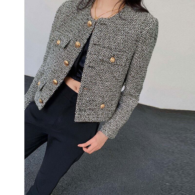 2021年秋冬ウィメンズツイードジャケットヴィンテージボタンアップ長袖Oネックポケットレディコートトップス ロング オータム 秋物 ウィンター 冬物 ビンテージ