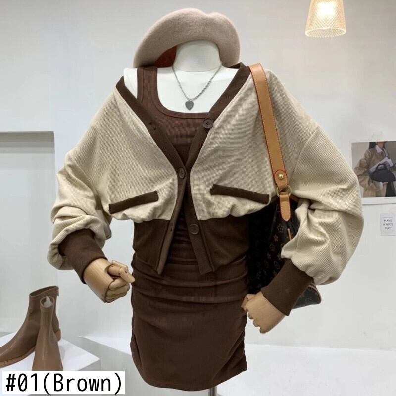 2021年女性秋冬セットVネック長袖カーディガン+ウエストスリムドレスツーピーススーツ ロング オータム 秋物 ウィンター 冬物