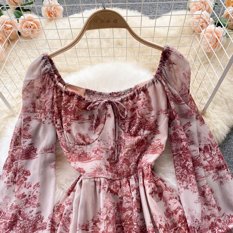 女性レトロプリントドレススタイル長袖Aラインシフォンドレス2021秋の休暇ショートドレス ロング オータム 秋物