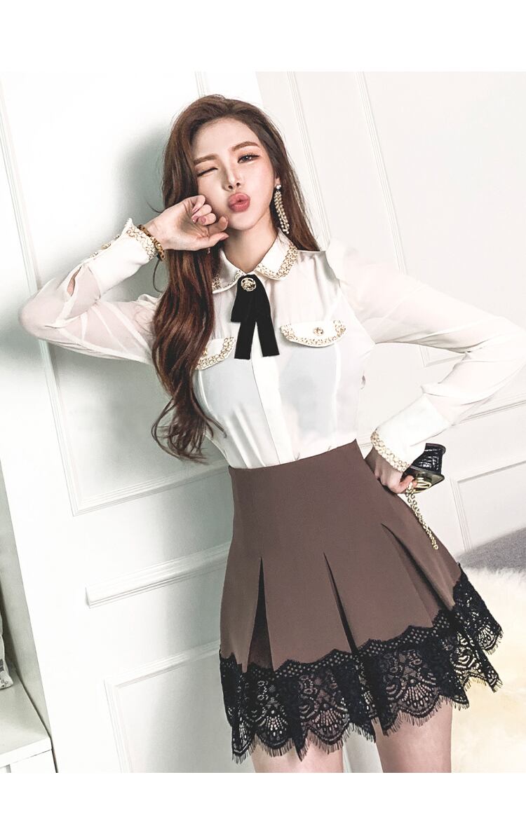 2021年春のオフィスレディターンダウンカラー長袖ボウシャツトップ+ウエストレースAラインスカートスーツ女性2点セット ロング リボン スプリング 春物 会社 学校 通勤や通学にも