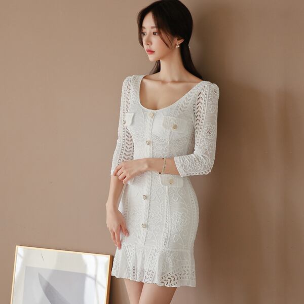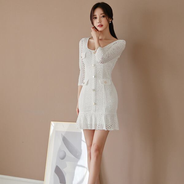 夏の女性のミニドレス七分袖OネックフリルドレスセクシーなヒップパッケージショートオフィスレディVestidos ラッフル サマー 夏物 会社 学校 通勤や通学にも