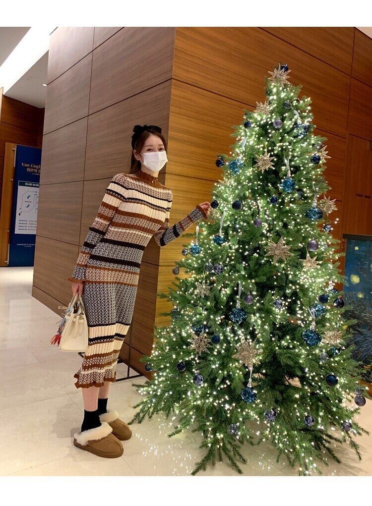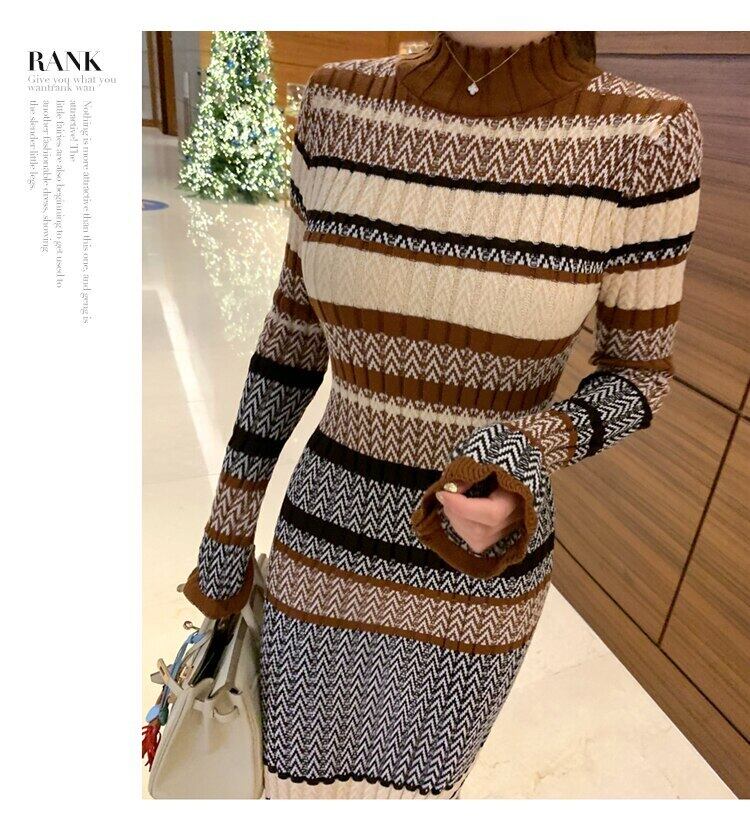 ストライプ秋冬ドレスヴィンテージスリム女性セータードレス女性ニットドレスミディジャンパードレス オータム 秋物 ウィンター 冬物 ビンテージ
