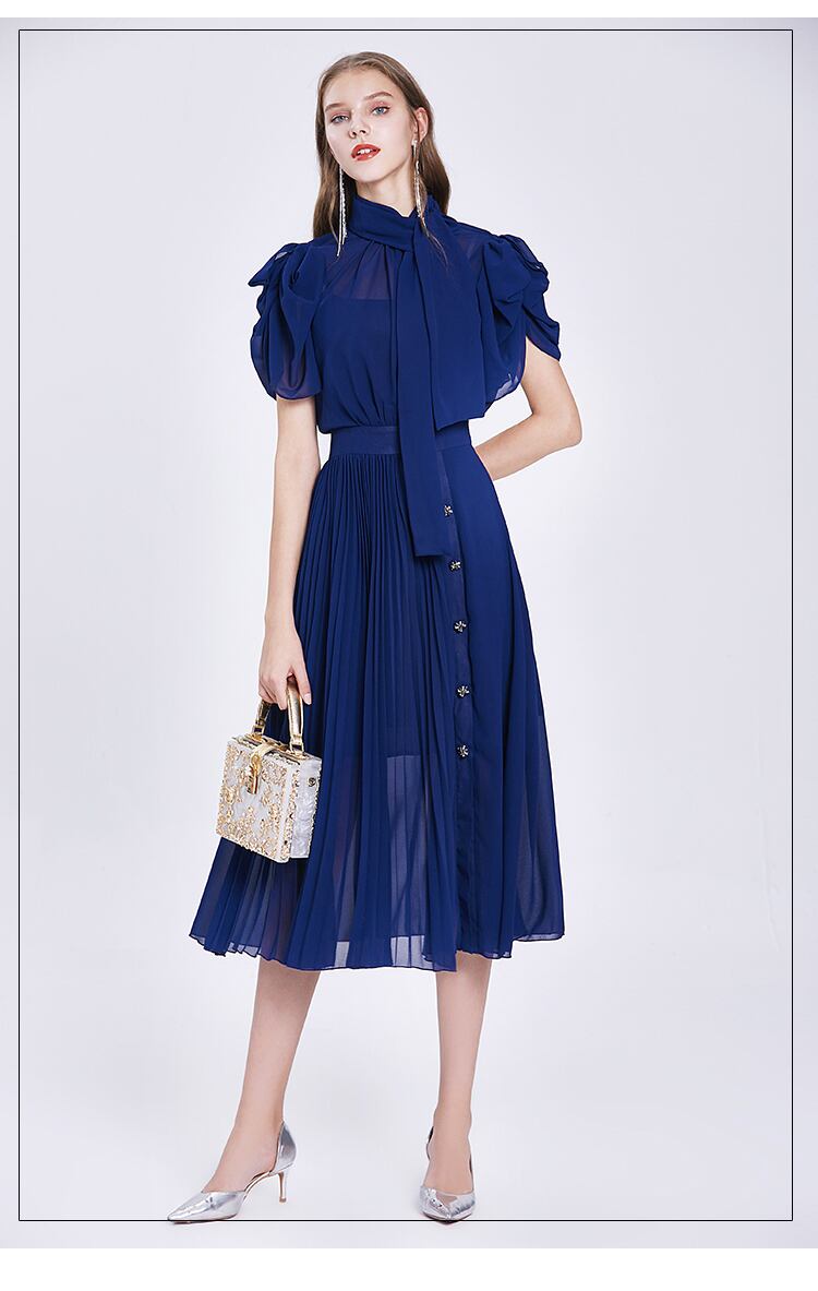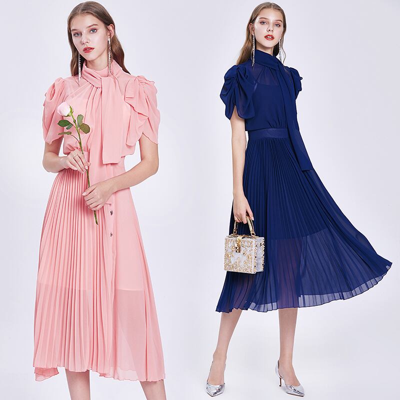 ヴィンテージボウノットカラーピンクサマーシフォンプリーツミディロングドレスレトロなオフィスレディワークドレスボタン付き リボン 夏物 ビンテージ 会社 学校 通勤や通学にも
