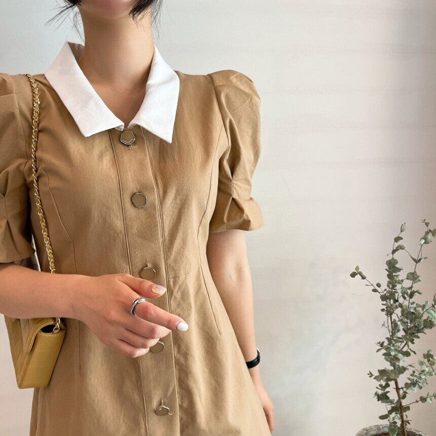 女性のドレス2021シックな夏の気質ラペルシングルブレストスリムウエストパフスリーブドレスVestidos サマー 夏物